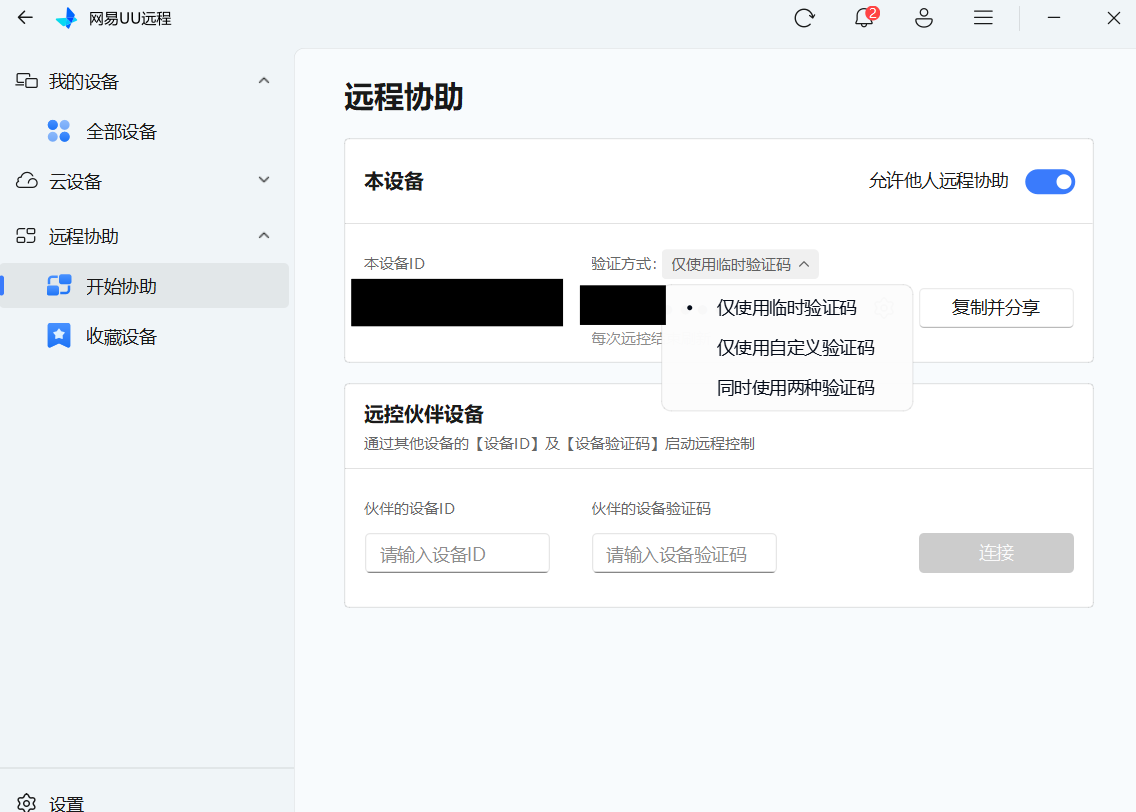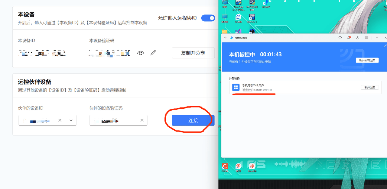 拿取设备ID和设备验证码点击连接即可发起远程控制