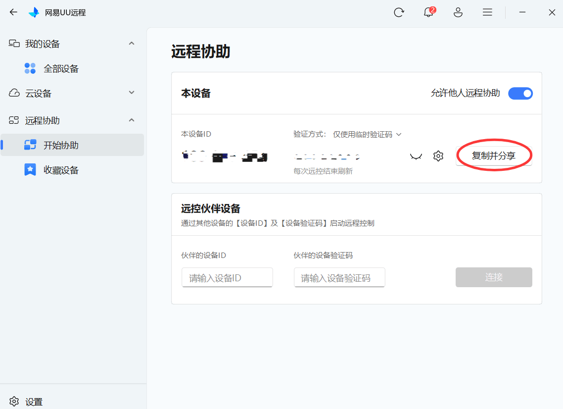 免登录功能彻底颠覆了这一模式:被协助方无需注册账号,也无需输入手机号、邮箱等个人信息,只需打开 APP,进入【远程协助】板块,即可直接显示本设备 ID和动态验证码。更便捷的是,APP 内提供 "复制并分享" 一键功能,可直接复制设备 ID、验证码及专属连接,通过微信、QQ、短信等任意社交工具发送给协助方。