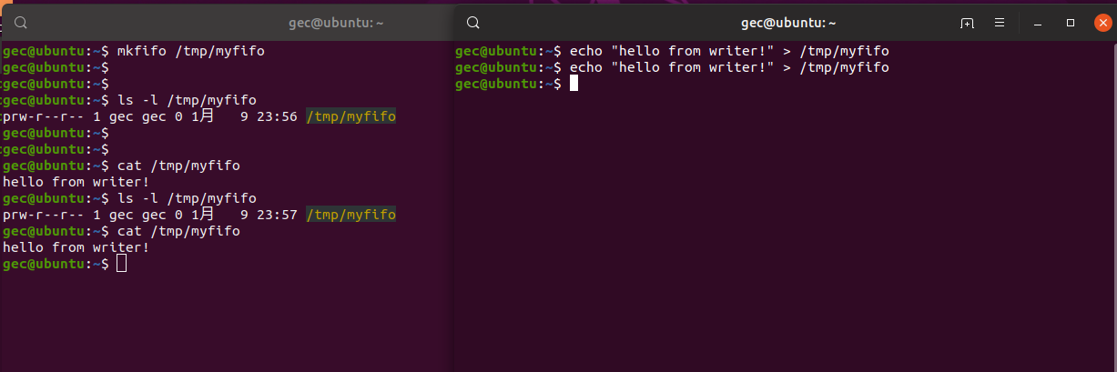 (4)echo "hello from writer!" > /tmp/myfifo,将文本内容输入到管道文件中