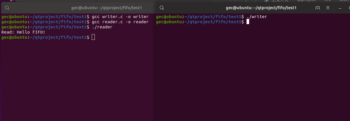和之前的代码测试不同,fifo文件可以在终端直接通过Linux命令创建,并在两个终端中实现通信。