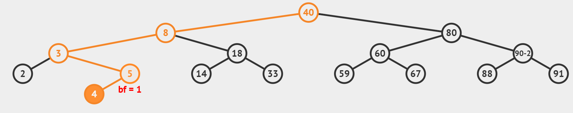 以平衡二叉树为例(AVL),将一堆元素按照"左小右大"的特点存储,如下图,80 > 40,存在右边,8 < 40,存在左边,每个元素都是如此,此时再存入一个元素,如 4,