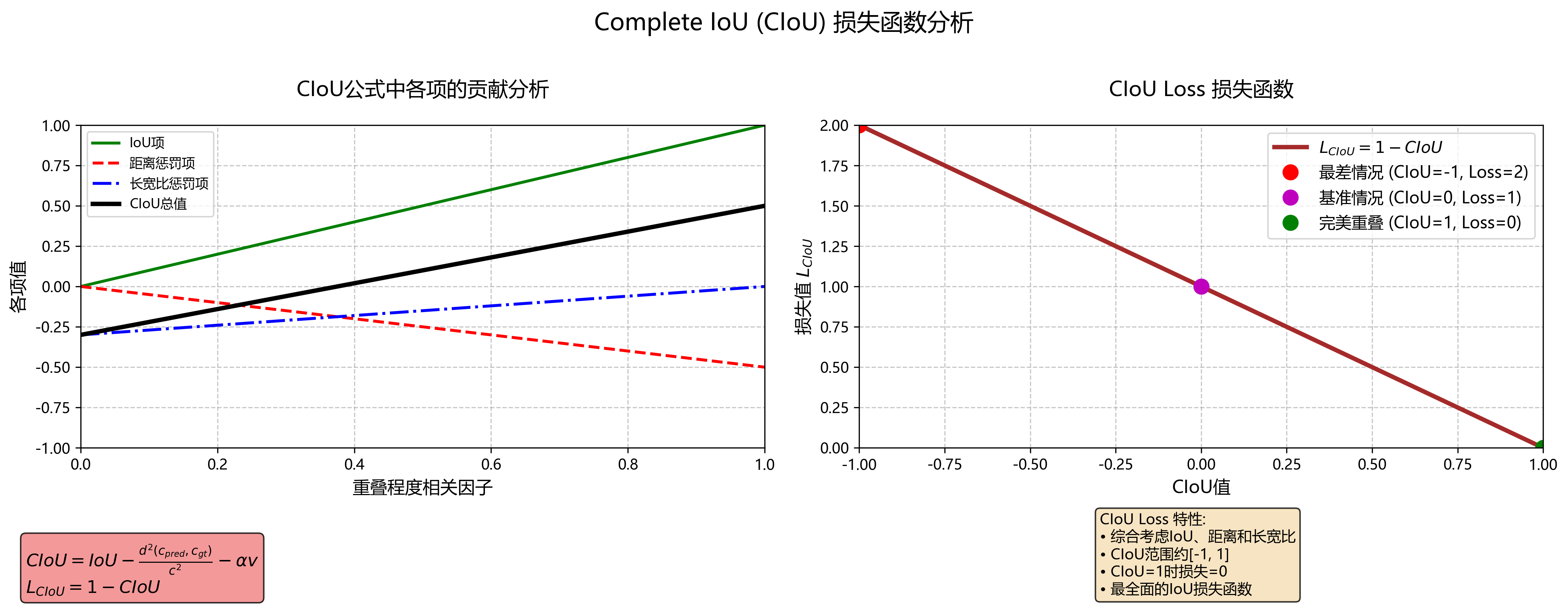 计算方式: 综合 IoU、中心点距离与宽高比一致性,定义