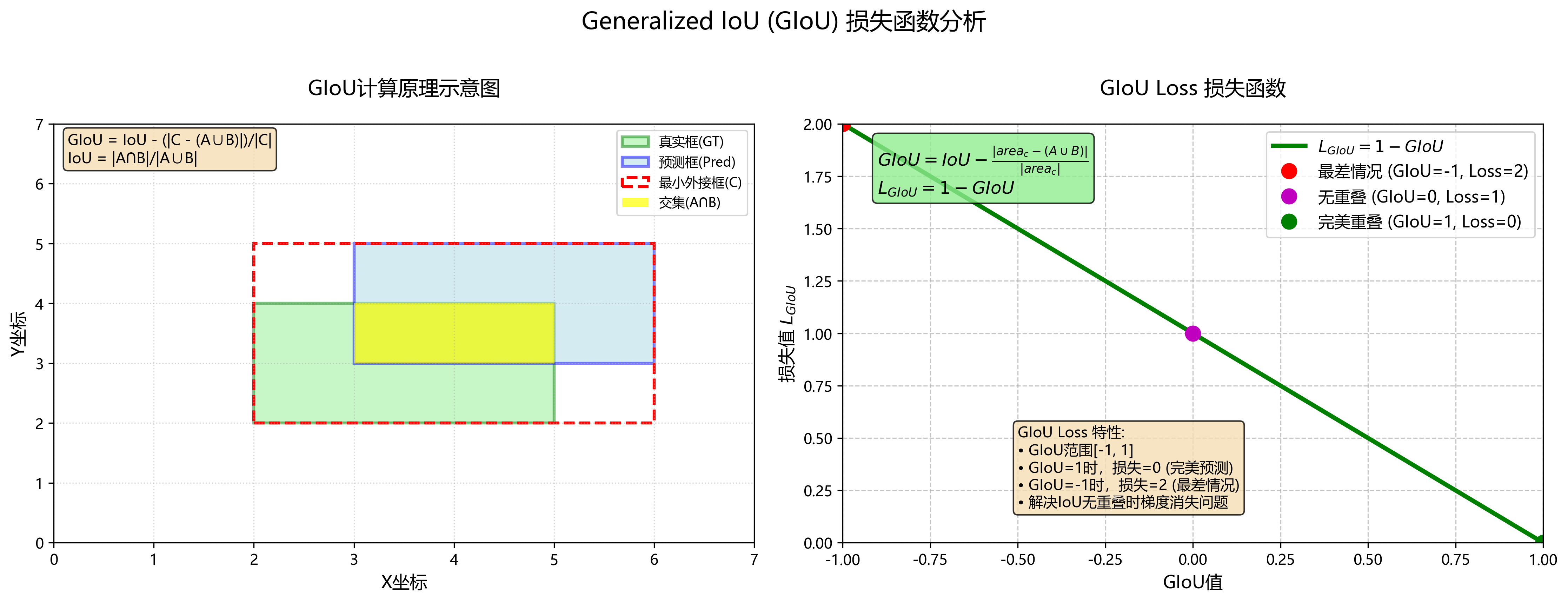 计算方式:GIoU通过考虑预测框和真实框的最小外接框的面积,引入了额外的信息来优化损失。GIoU损失计算公式为: