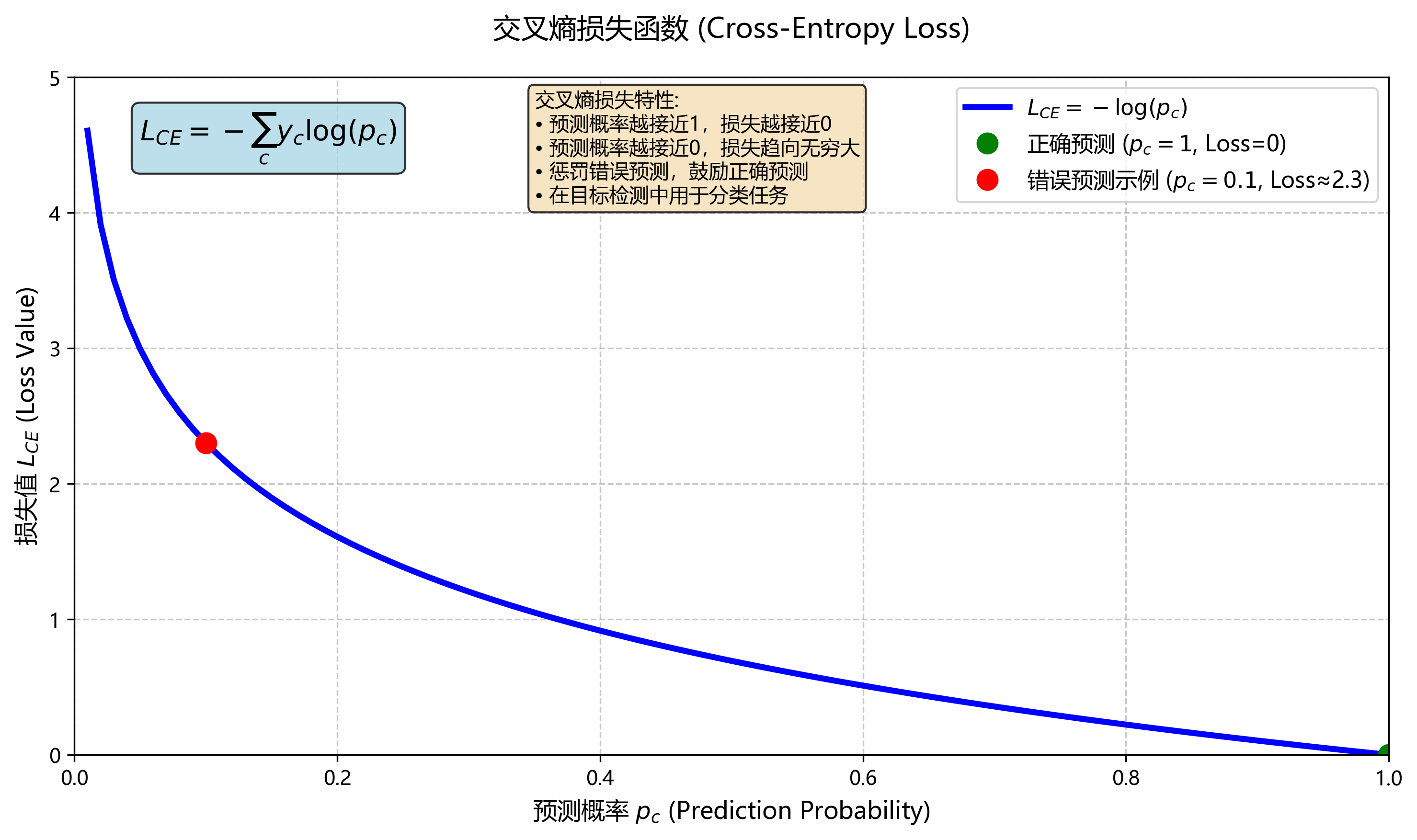 计算方式:对于每个锚点/位置的类别预测,令模型对类别 c c c的预测概率为 p c p_{c} pc,真实标签为one-hot向量,则