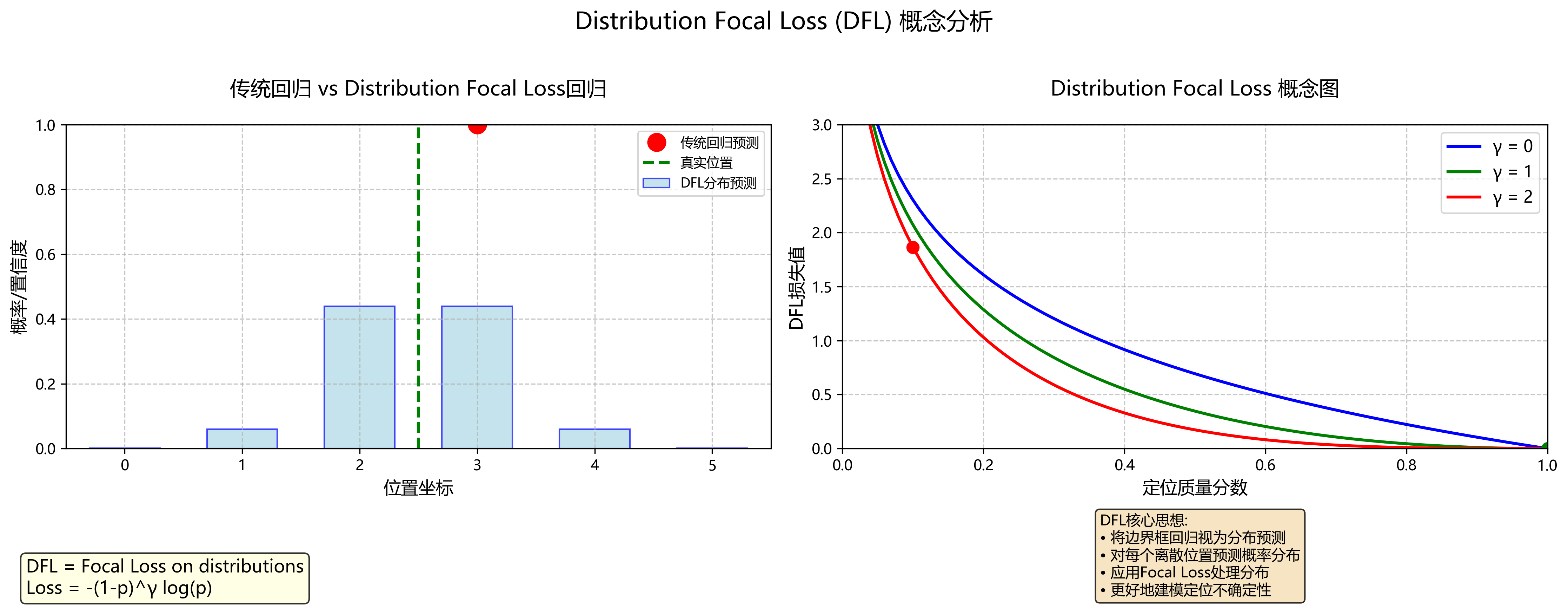 (1)传统回归直接预测坐标,忽略不确定性;(2)预测离散分布并施以 Focal Loss,更好地捕捉位置不确定性,提升定位质量。