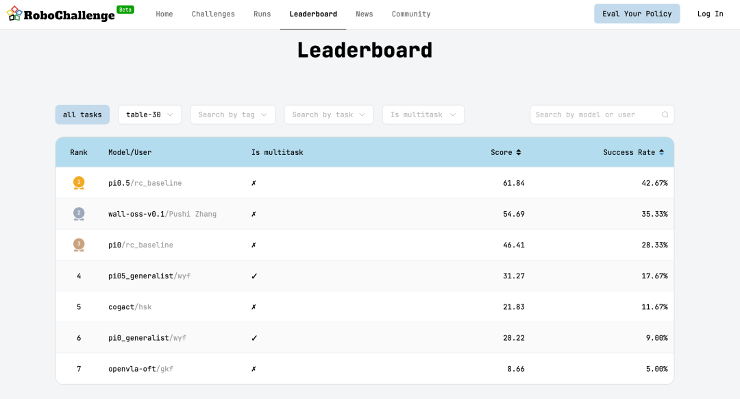 近日,全球首个大规模多任务的真机基准测试平台RoboChallenge榜单更新,前三名依次为pi0.5、WALL-OSS和pi0。