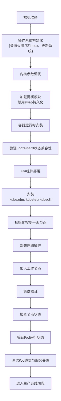 以下 Mermaid 流程图展示生产级 K8s 集群从裸机准备到集群验证的全流程,突出内核参数调优的前置关键地位,流程适配 K8s 1.24+ 版本(容器运行时采用 Containerd)。
