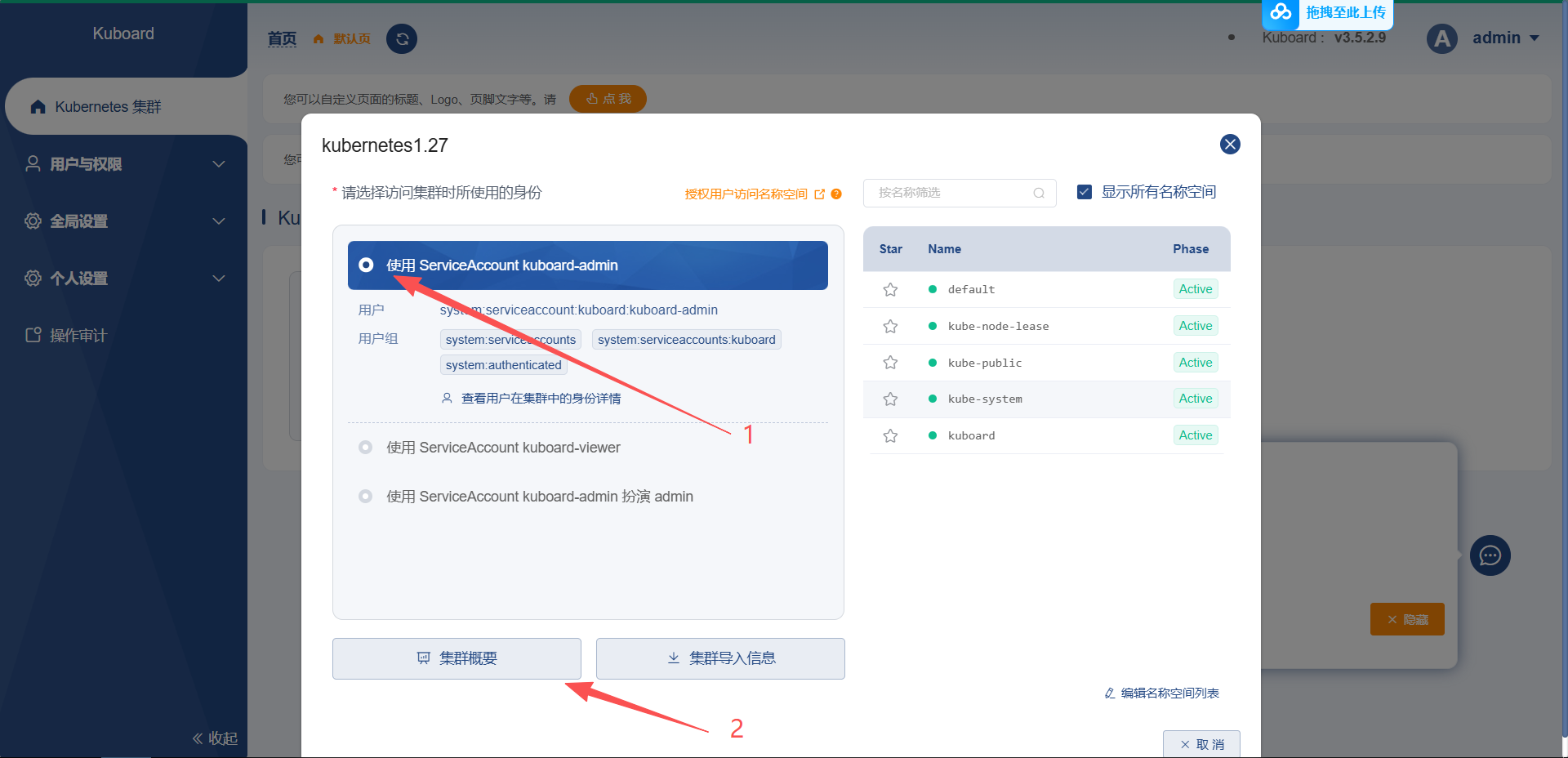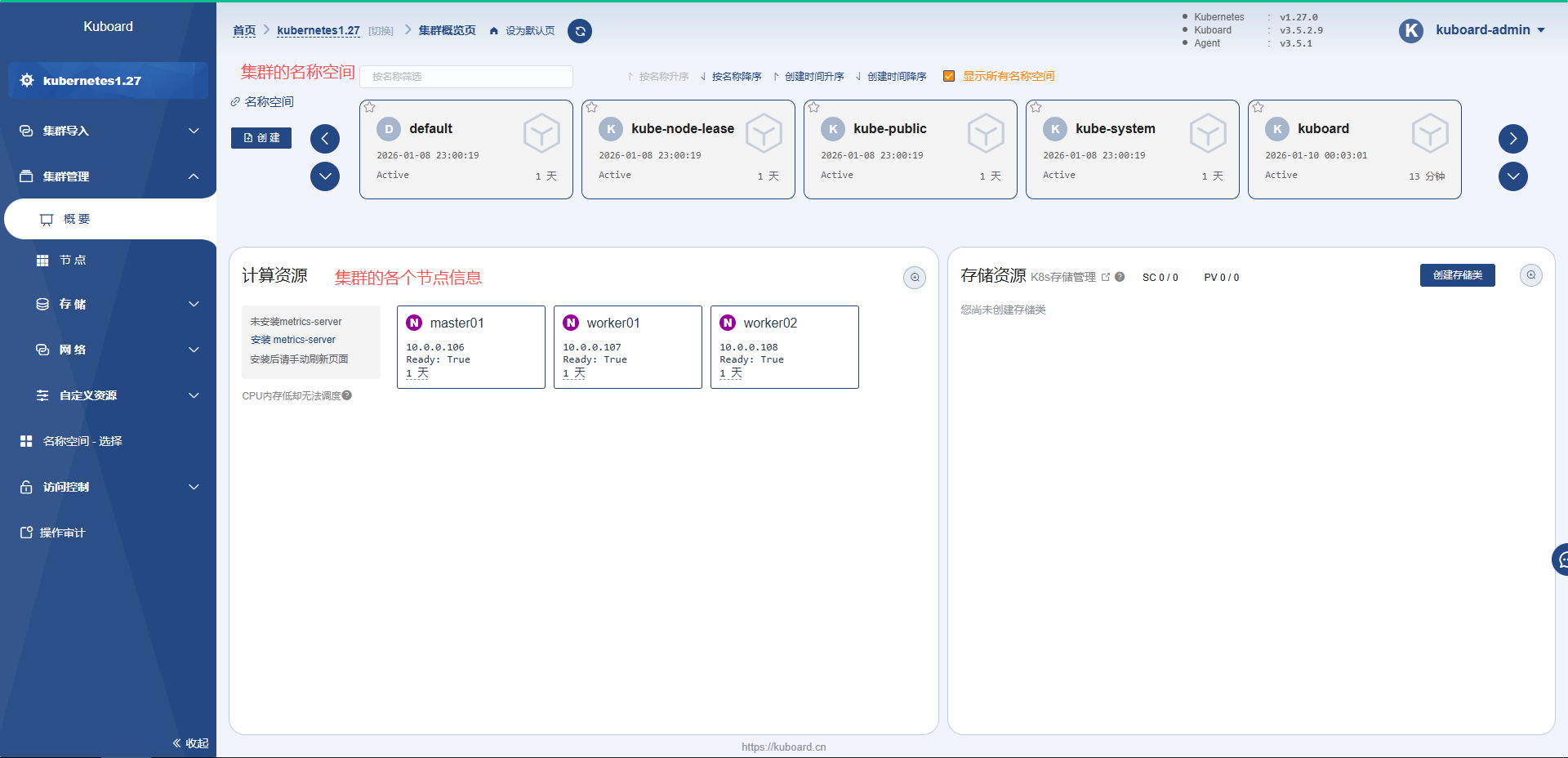 返回kuboard的web页面,选择使用admin用户,然后点击集群概要,就可以查看集群相关信息了