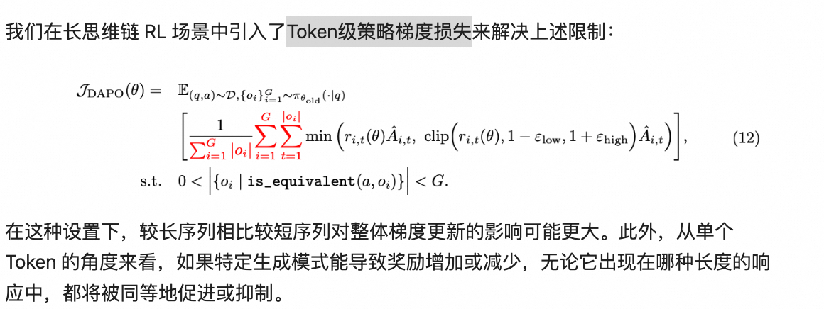 - "较长序列相比较短序列对整体梯度更新的影响可能更大": 这是因为在Token级平均中,一个长度为100的序列会贡献100个token的损失项到总和中,而一个长度为10的序列只贡献10个。因此,长序列在计算总平均损失时有更大的"话语权"。