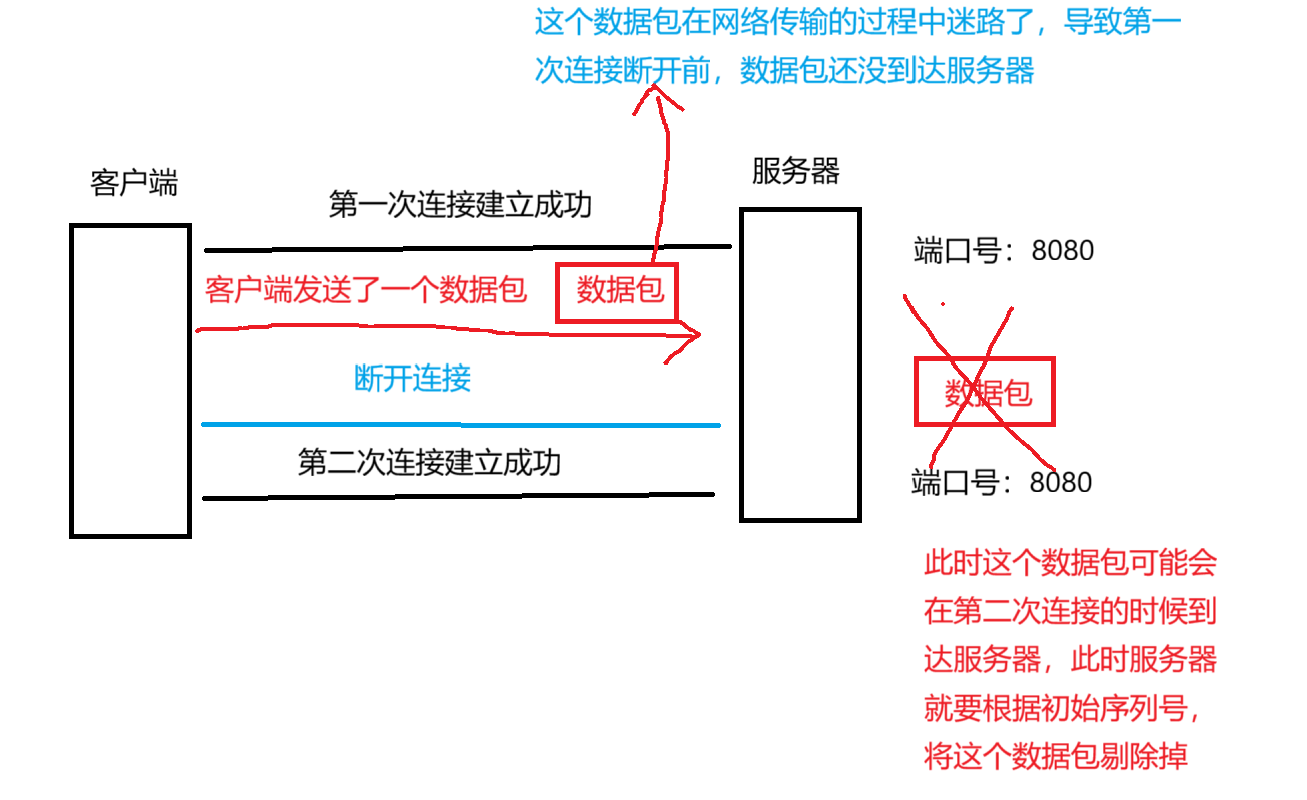 假设客户端和服务器建立了一次链接,客户端发送了一个数据报,但是此时数据包在传输的过程中迷路了,此时客户端和服务器之间断开连接,过了一段时间,客户端和服务器再次建立连接,如果没有协商好初始序列号,此时服务器还是根据上次连接时的初始序列号读取数据,此时服务器就可能接收到了上次连接时的迷路的数据包,显然这个迷路的数据包不是一个有效的数据包,此时服务器就没必要去处理这个数据包而是要将这个数据包剔除掉,此时就可以根据建立连接过程中协商好的初始序列号来解决这个问题