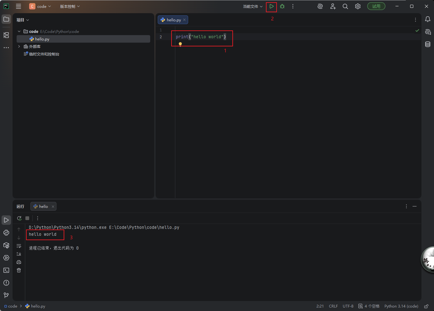 在新建的Python文件:hello.py中输入代码,点击运行,下面显示出运行信息