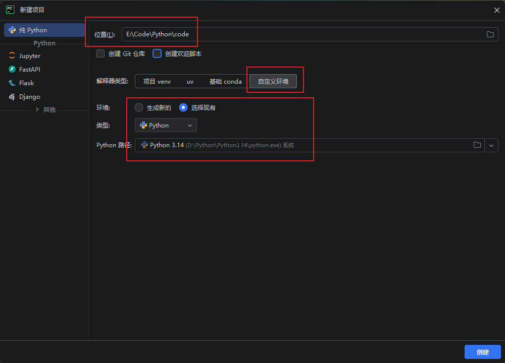 选择项目保存位置,点击"自定义环境",选择解释器