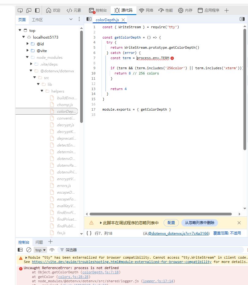 项目根目录执行 npm install tty-browserify process 命令