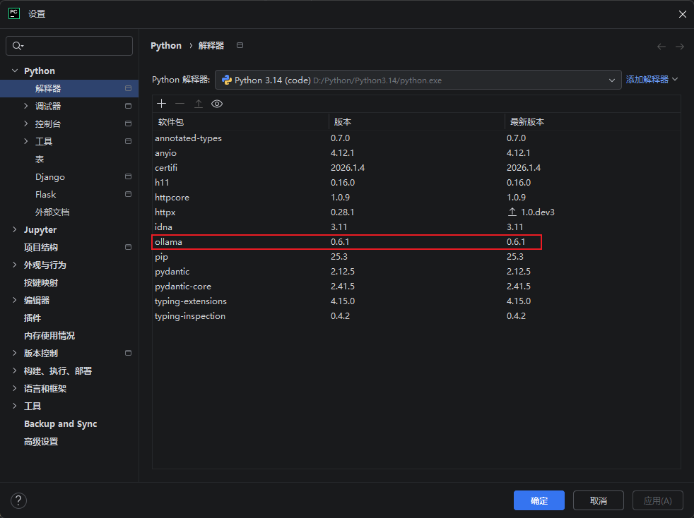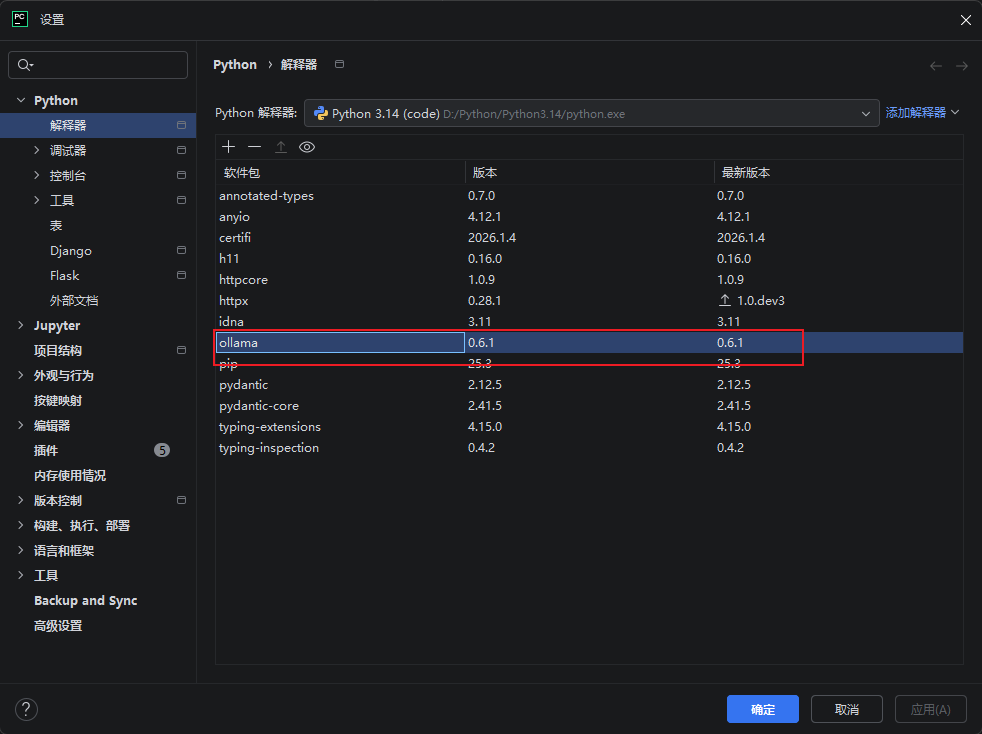 关闭解释器设置,并重新打开,可以看到安装好的ollama解释器