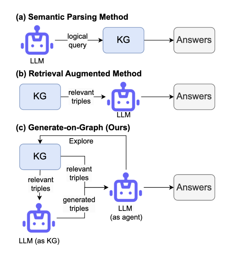 图1 LLMs 与 KGs 结合的三个范例,(c) 是GoG 方法框架图