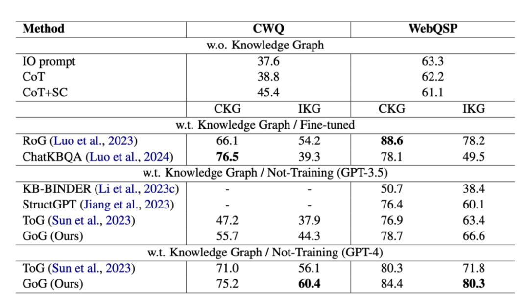 **(3)验证了方法的有效性:**在两个基准数据集上的实验结果表明,GoG 的性能优于所有先前的基线方法(包括 ToG, StructGPT 等)。实验证明,通过将 LLM 视为代理和知识库的双重角色,GoG 能够有效结合不完整的 KGs 回答复杂问题,显著提升了推理的鲁棒性。