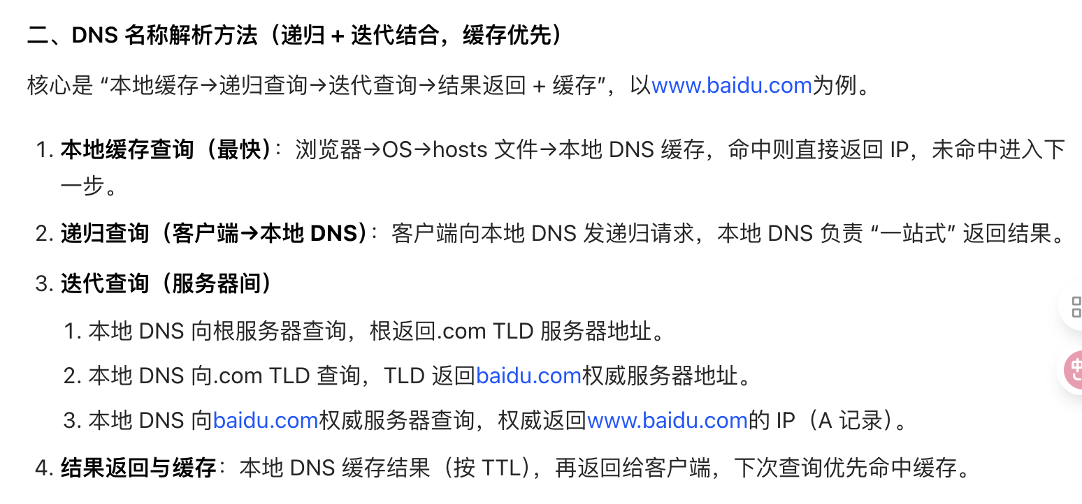 | 迭代查询 | 客户端向 DNS 服务器发出请求,若服务器无答案,则返回"下一个应查询的服务器地址",由客户端自行继续查询 | 由客户端承担全部解析责任 |