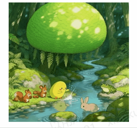 治愈系森系插画风格(吉卜力手绘质感),动态场景:圆滚滚黄色小团团蹲在森林小溪边,橙色小爪子反复轻拍水面,每一次拍打都溅起细碎的透明水花,水花在空中短暂散开后落回溪面,漾开圈圈浅蓝波纹;红松鼠蹲在旁侧草地上,一只抱着坚果啃咬,另一只歪头盯着小团团的动作,坚果壳偶尔从爪间滑落;浅棕色绒毛小兔扒在溪中苔藓石上,耳朵随身体轻轻晃动,前爪探入溪水里划动,带起细密的水纹;胖青蛙蹲在岸边岩石上,后肢微微蜷缩,前爪缓慢抬起又落下,眼珠跟着小团团的爪子转动;背景里球形树冠的光斑在地面、溪面缓慢移动,垂落的蕨类叶片被微风轻轻吹动,溪水持续潺潺流淌,整体画面动态轻柔且连贯 ------ar 4:5
