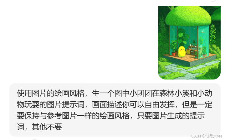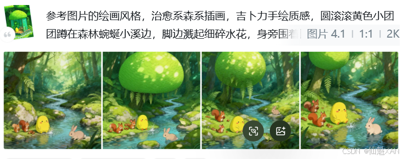 2、参照森林治愈系图片的风格,描述一场景,然后让豆包丰富场景,并提供图片生成提示词