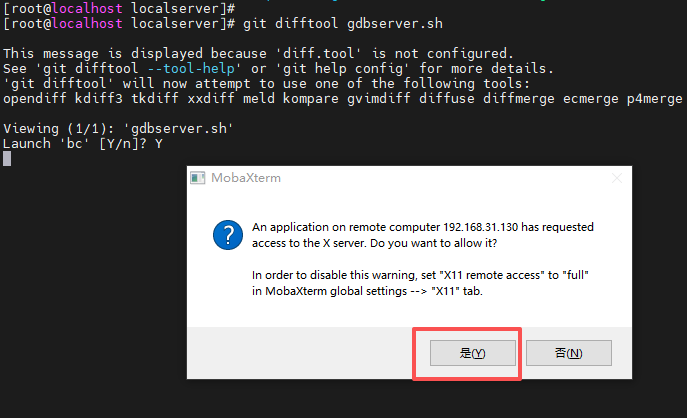 安装完后,通过git difftool命令比较文件,输入"Y":
