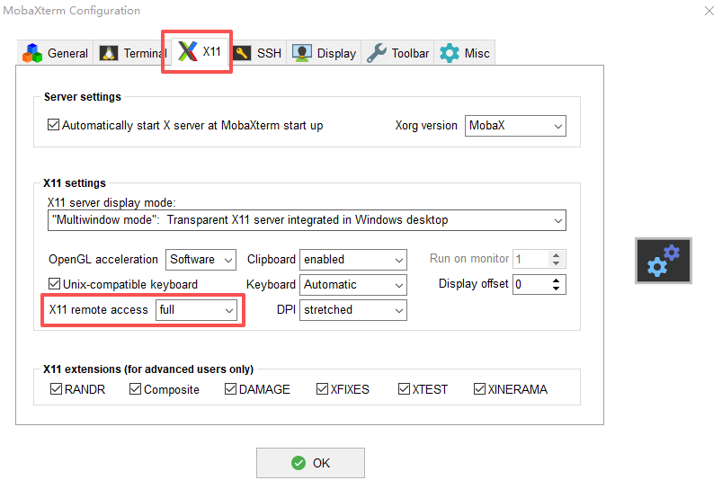 MobaXterm中,"X11"选项卡的"X11 remote access"这里选"full",点"OK":