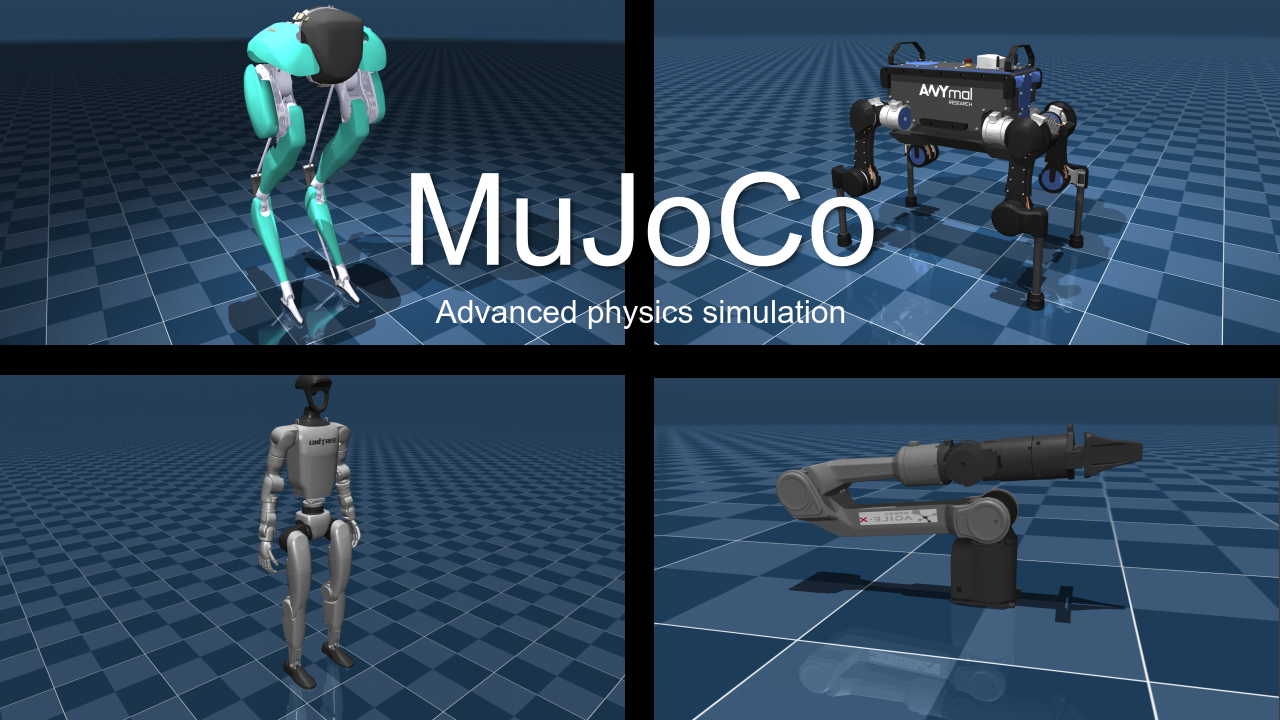 MuJoCo 是Multi-Joint dynamics with Contact 的缩写,字面意思可拆解为带接触的多关节动力学。 是DeepMind(谷歌旗下)维护的高精度多体动力学物理仿真引擎,专为机器人、机械控制、强化学习(RL)、生物力学等领域设计,核心优势是「精准的接触动力学」「高效的数值求解」「灵活的场景定义」,是目前科研和工业界公认的顶级物理仿真工具之一。