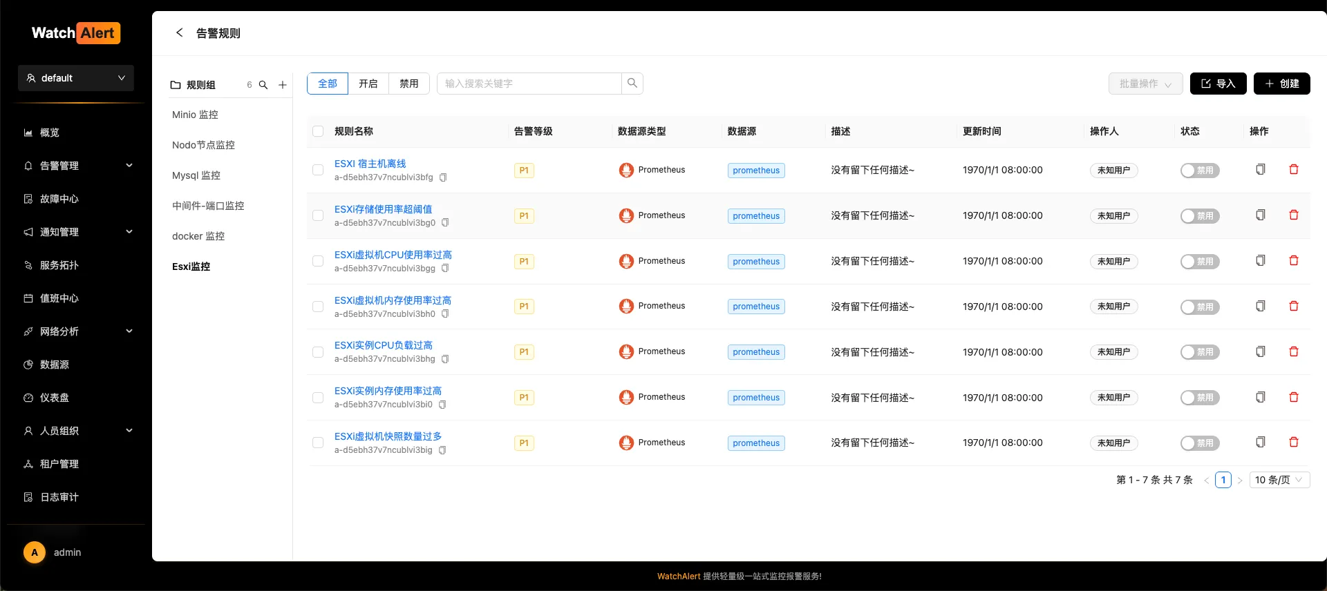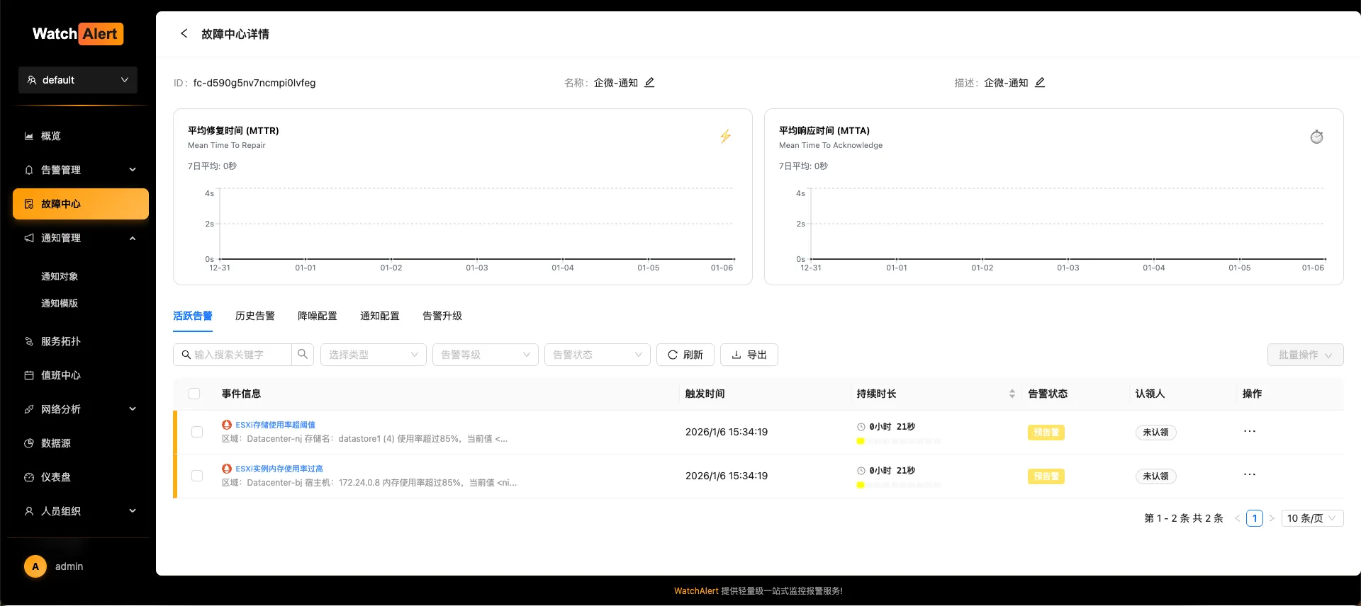 - 告警统一走内部的 Watchalert 组件,支持告警的聚合、抑制、通知。