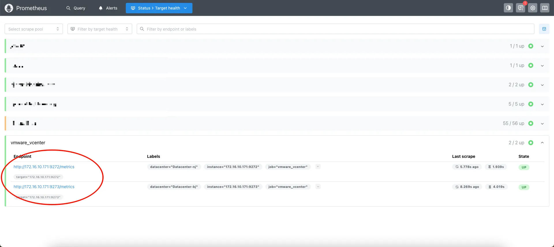 - Prometheus Targets 页面应看到 vmware_exporter 处于 UP 状态