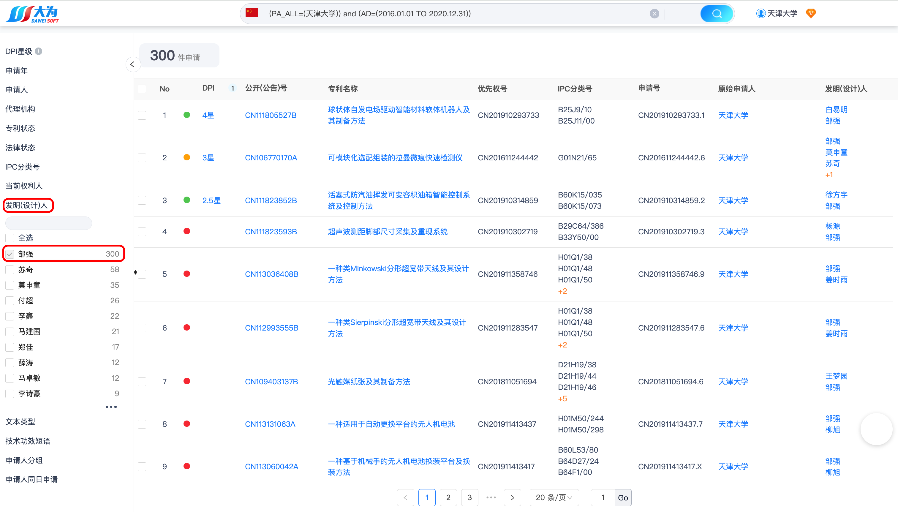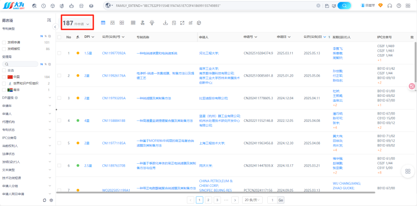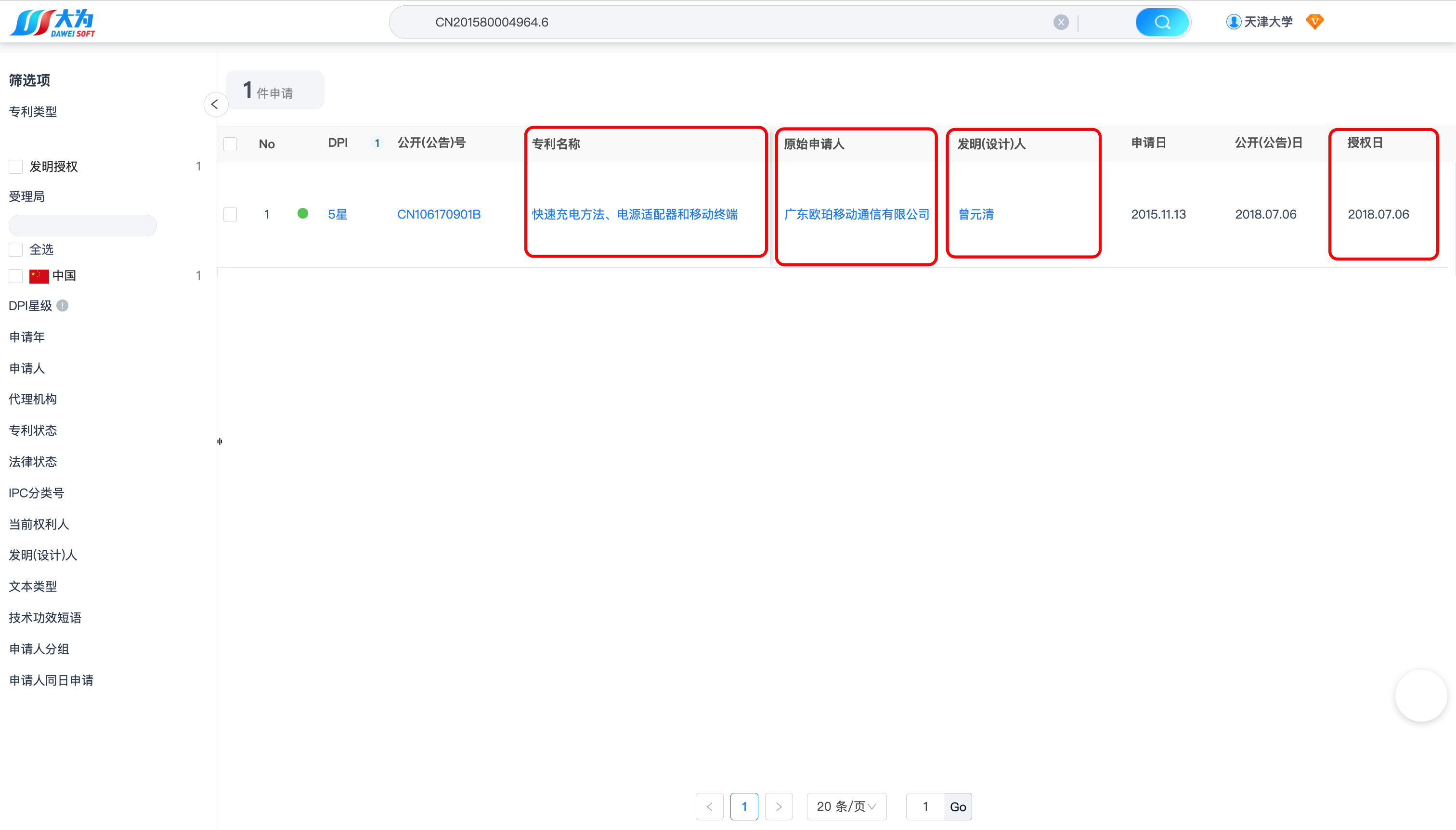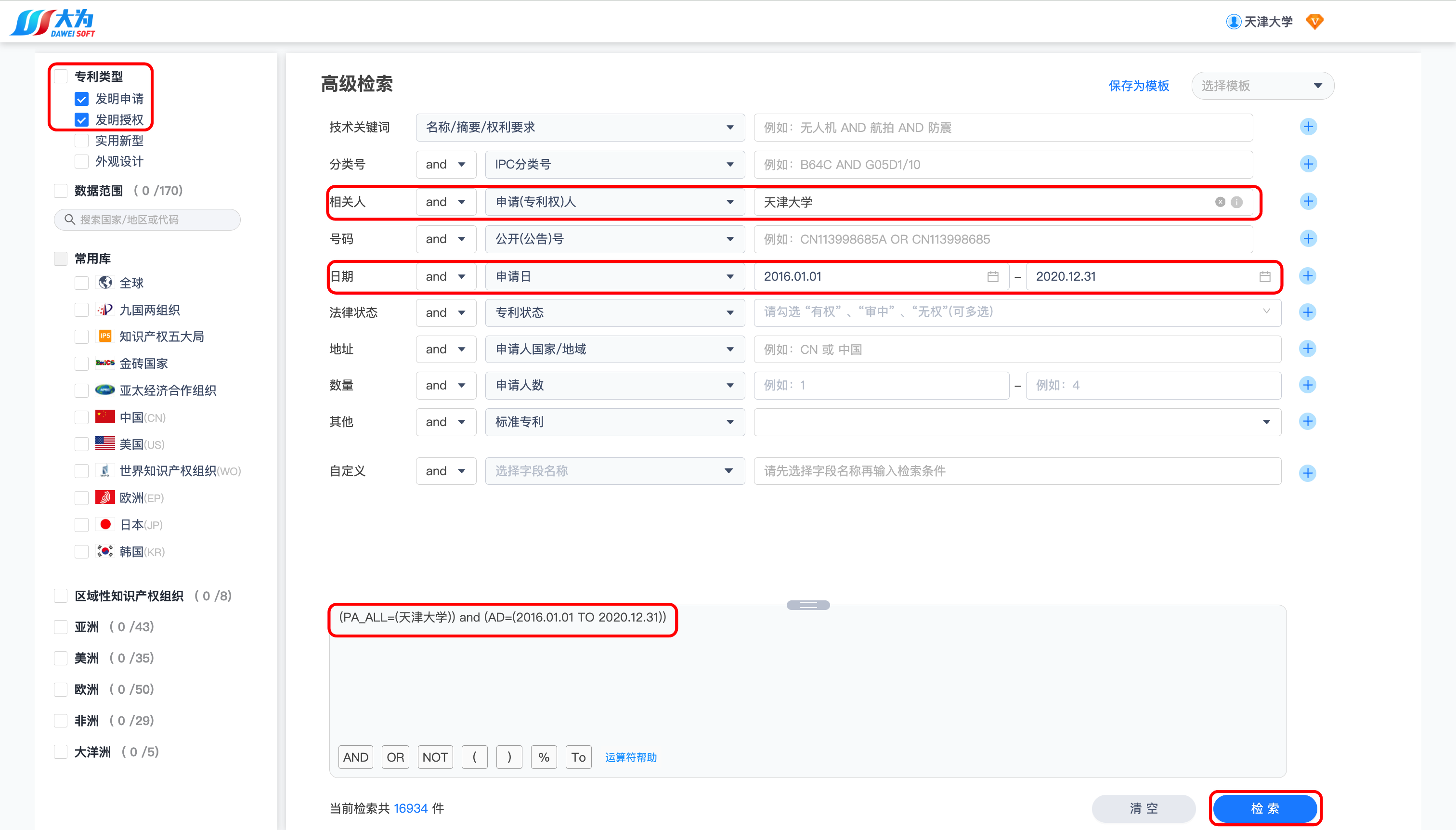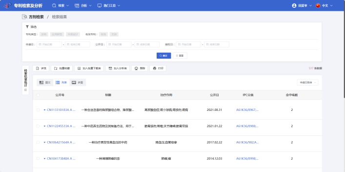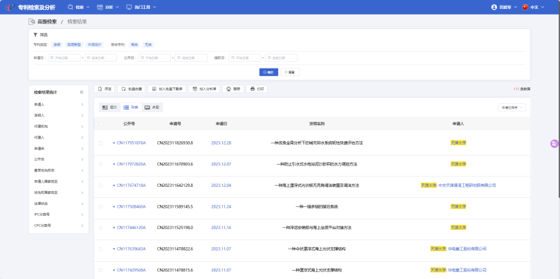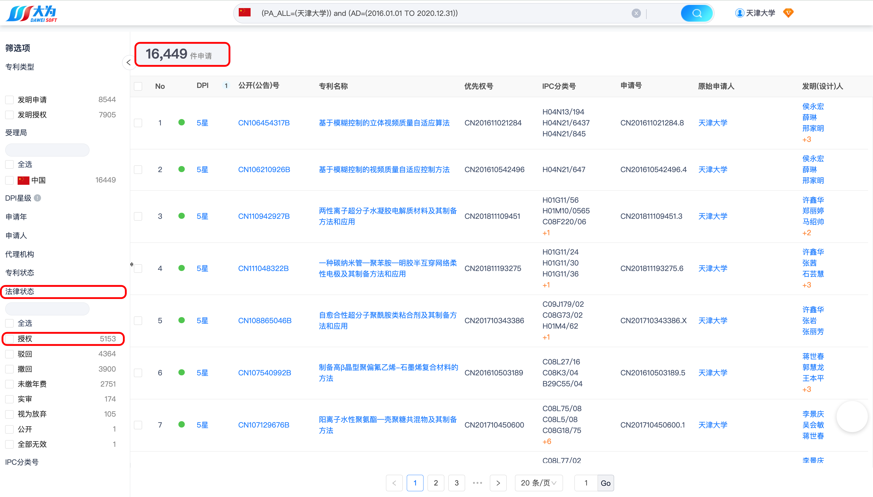 检索结果如下,可以看到天津大学2016年~2020年申请的中国发明专利数量:16449、授权专利数量:5153(当前法律状态为授权)。