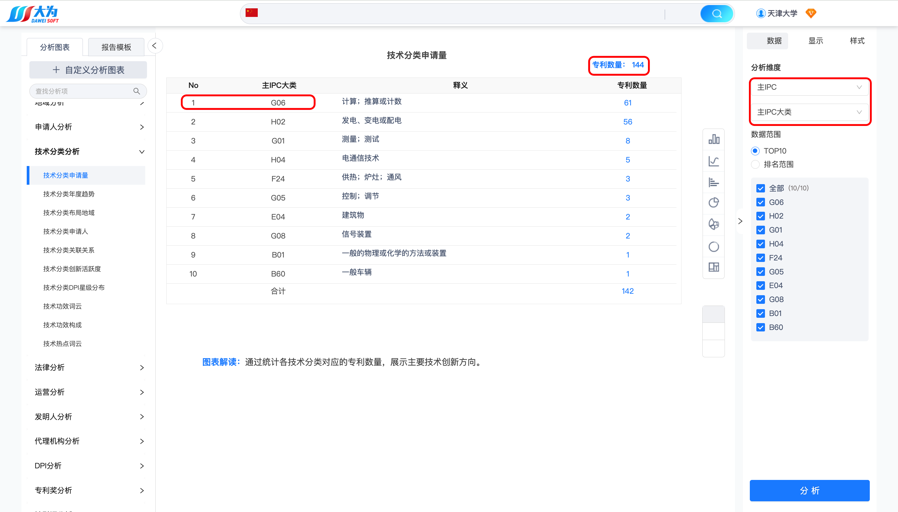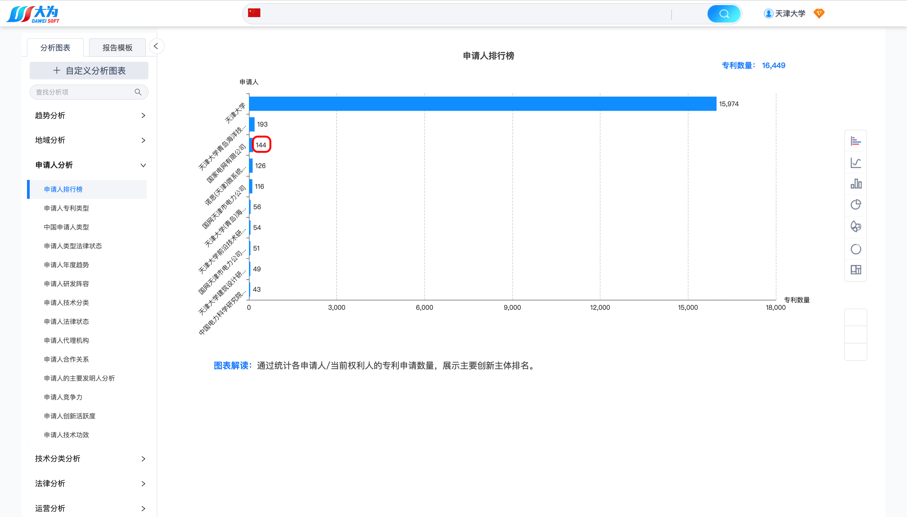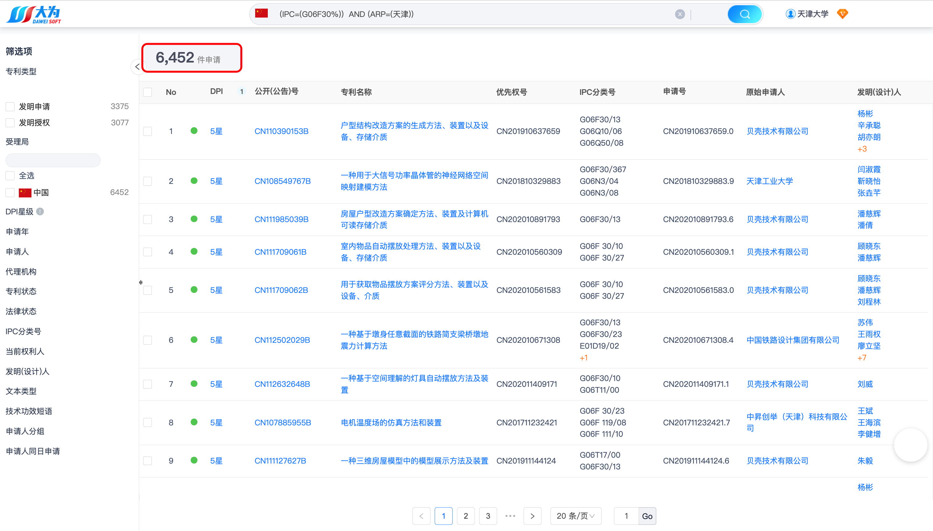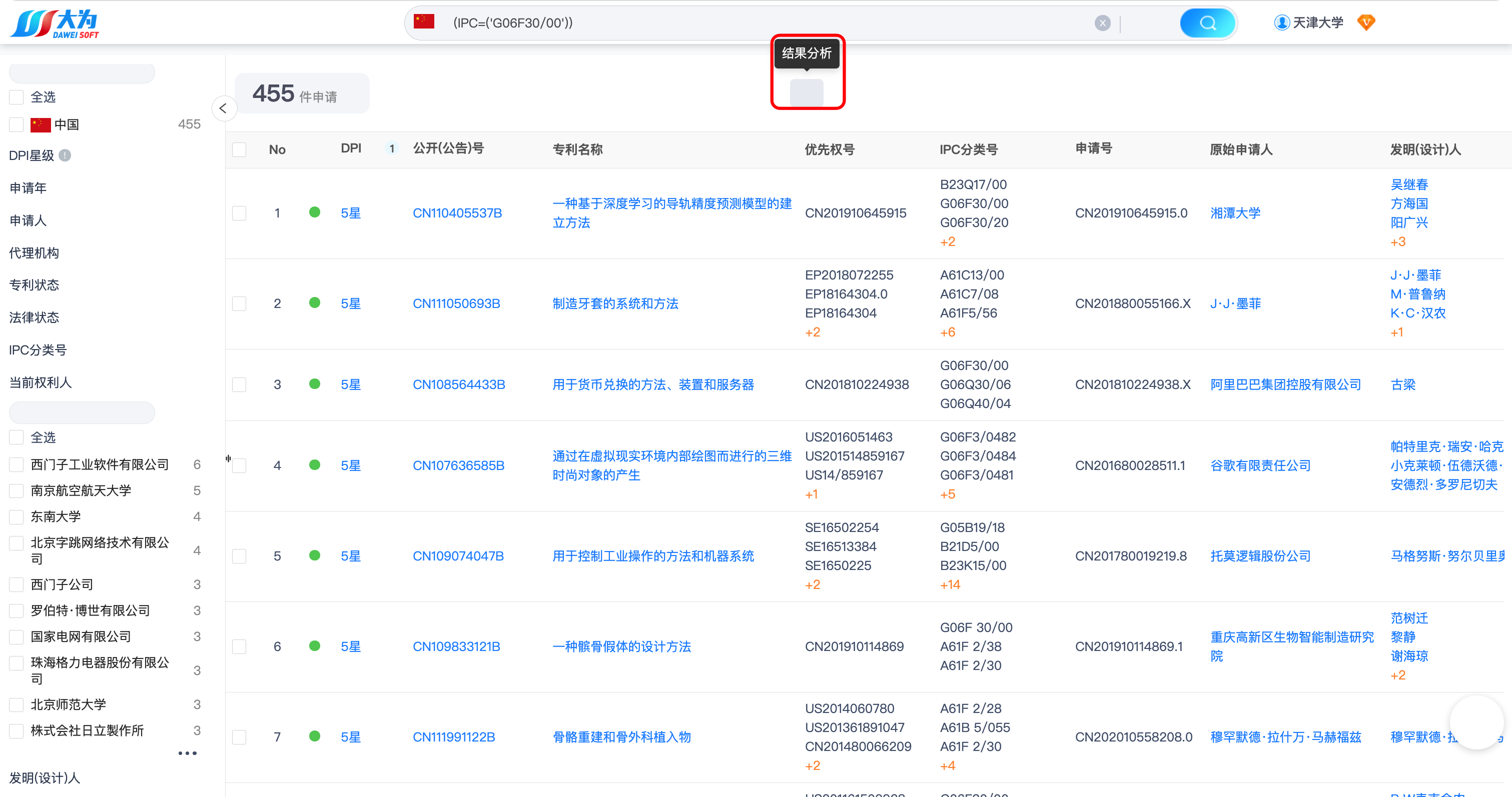 检索结果如下,可以看到天津大学2016年~2020年申请的中国发明专利数量:16449、授权专利数量:5153(当前法律状态为授权)。