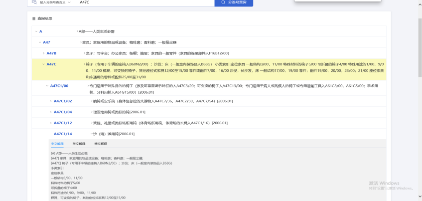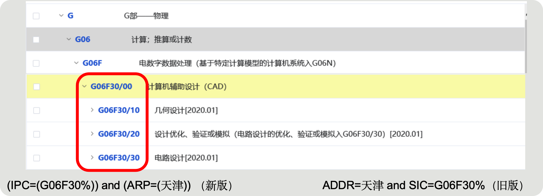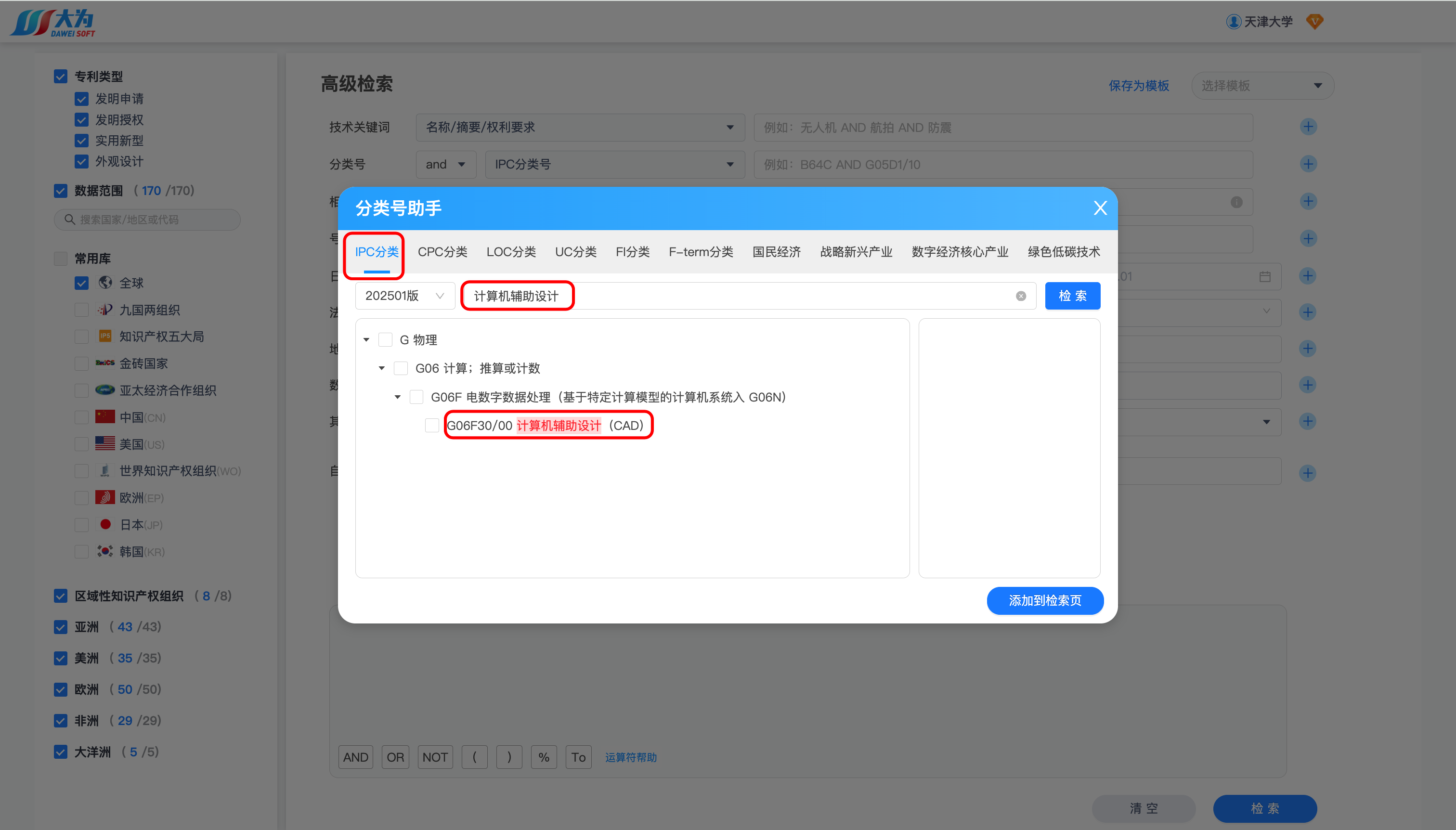 利用高级检索的分类号助手,可以看到"Computer-aided design"(计算机辅助设计的IPC分类号是G06F30/00。