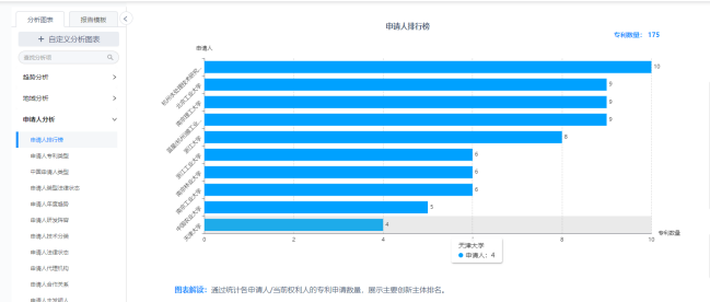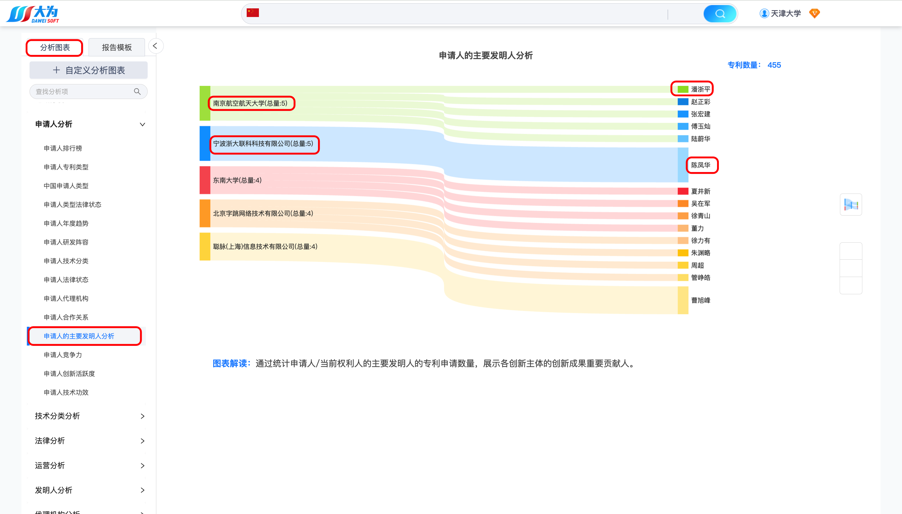 可以看到,申请专利数量最多的专利权人是南京航空航天大学和宁波浙大联科科技有限公司,其排名第一的合作者分别是潘浙平、陈凤华。