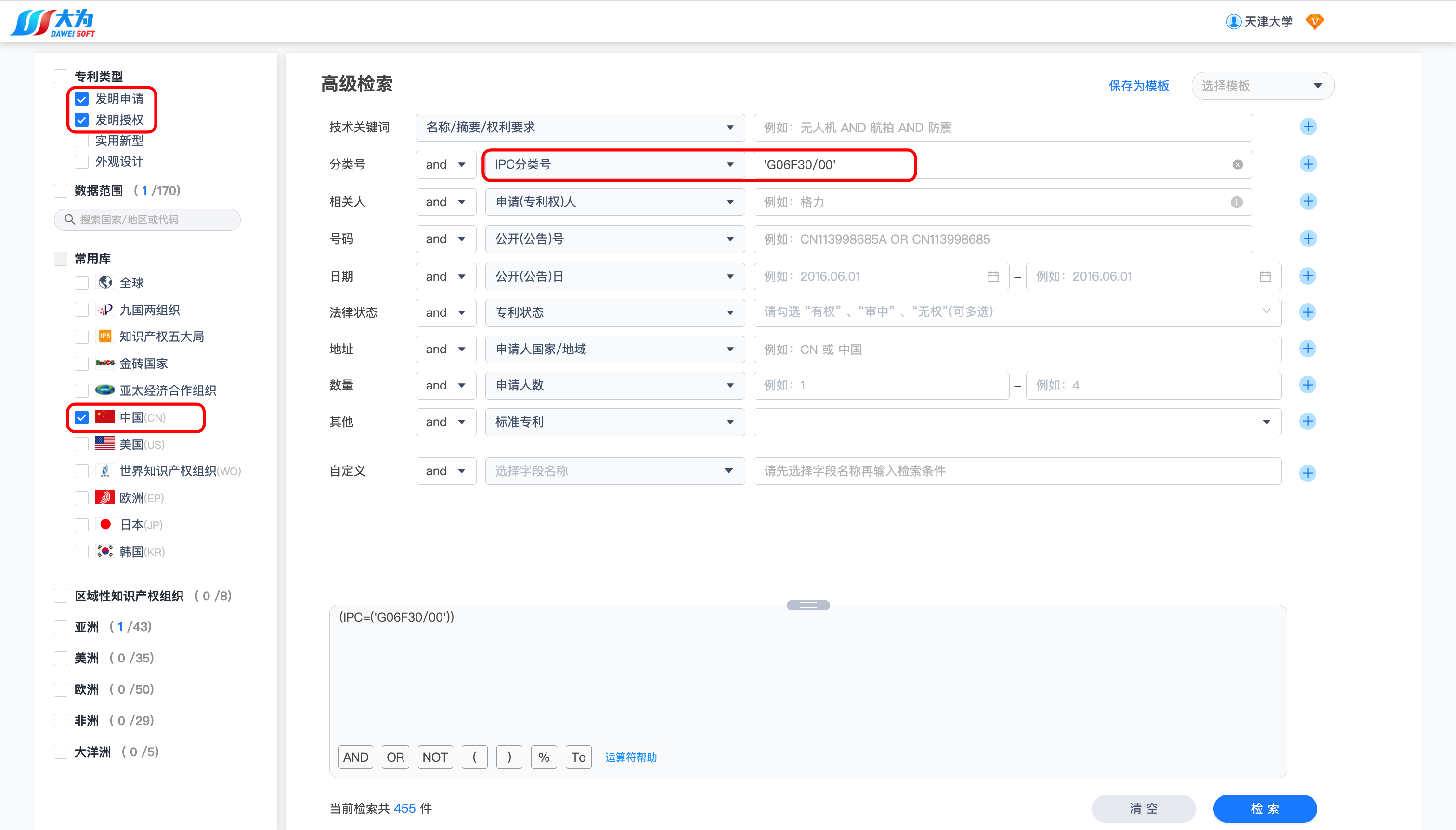 使用大为高级检索,检索设置如下:
