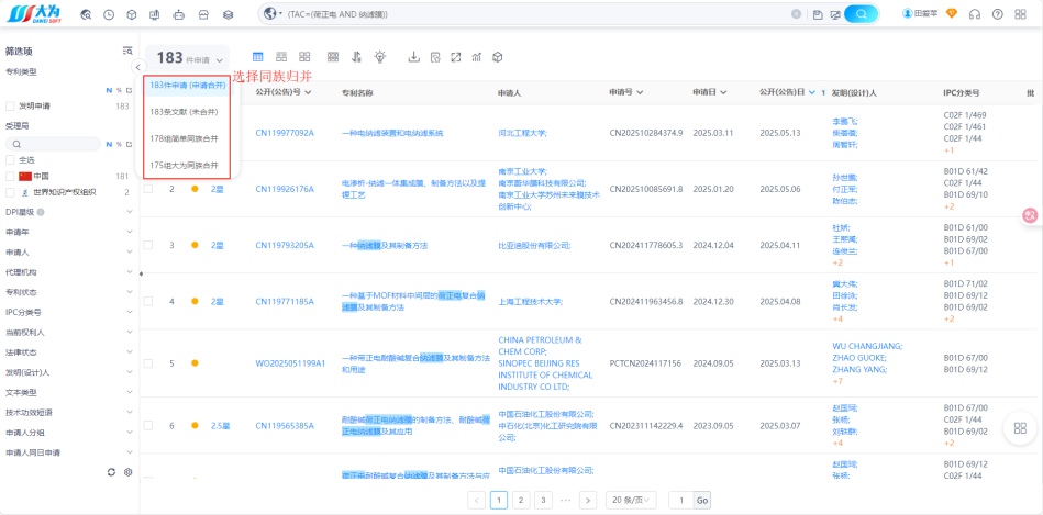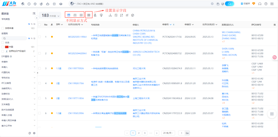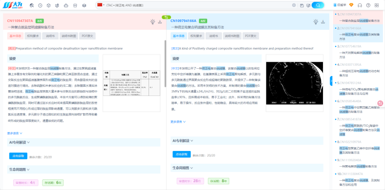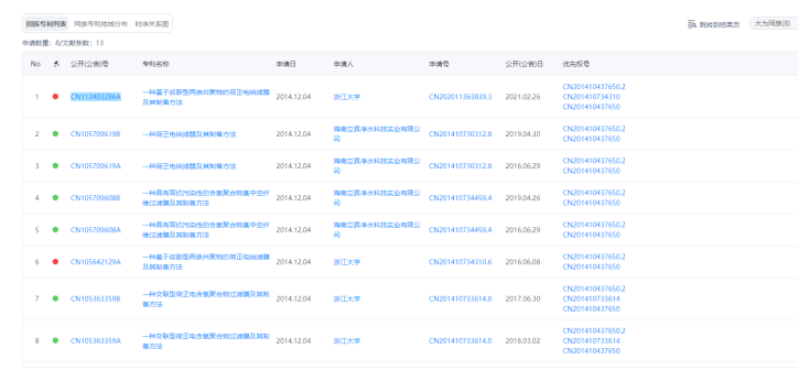 示例:调研荷正电纳滤膜领域中国发明专利申请情况