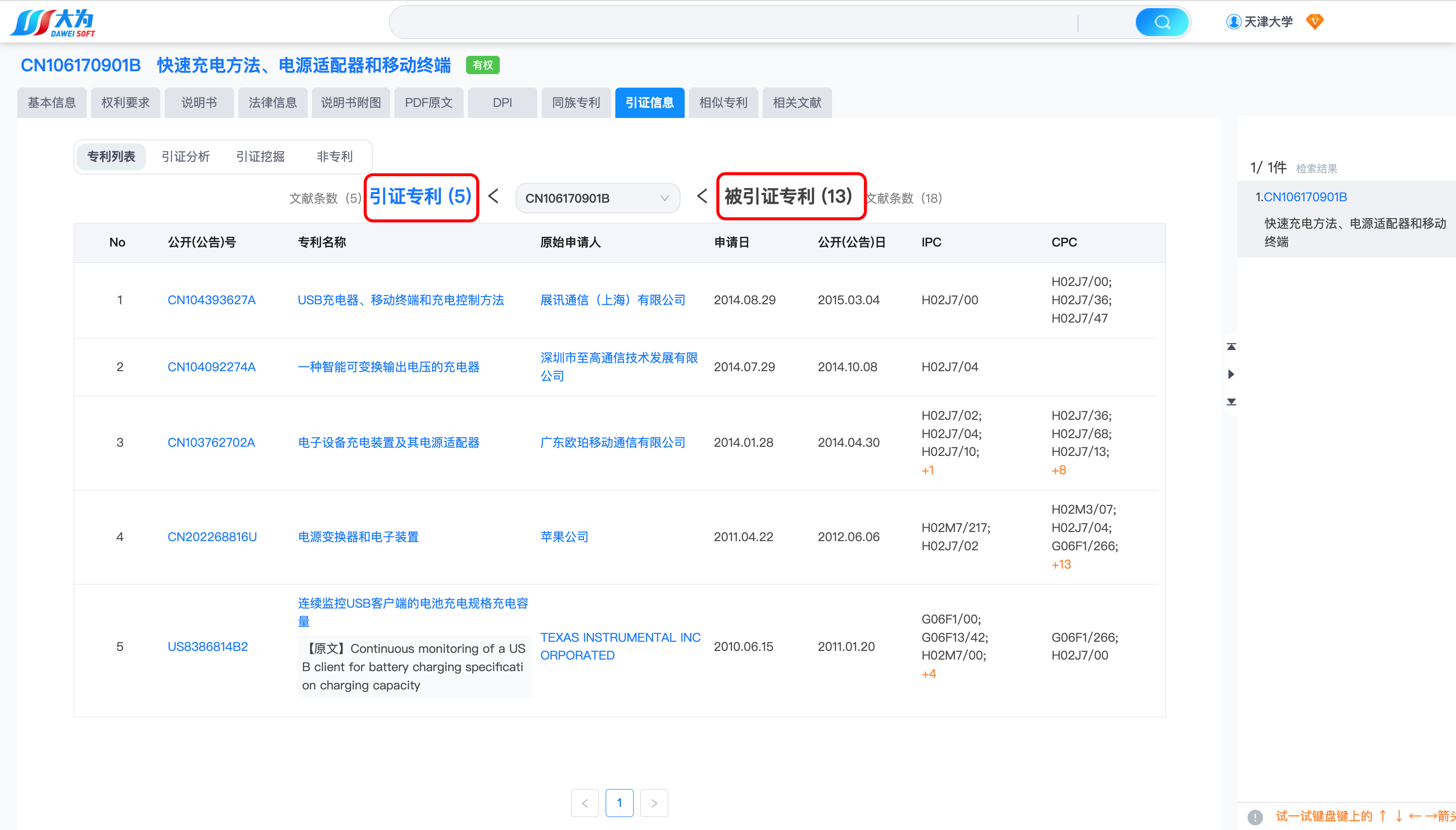 在专利详细页,选择引证信息。可以看到:该专利的引证专利数量:5;被引证专利数量:13。