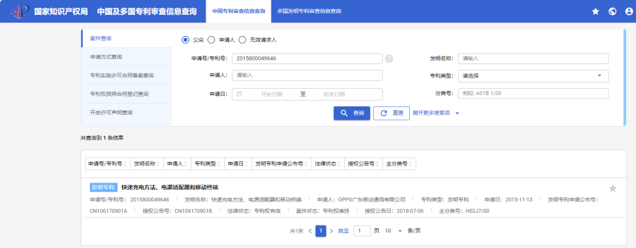 在检索结果列表页,可以看到专利名称:快速充电方法、电源适配器和移动终端、专利权人:OPPO广东移动通信有限公司、发明人:曾元清、授权公告日:2018.07.06。