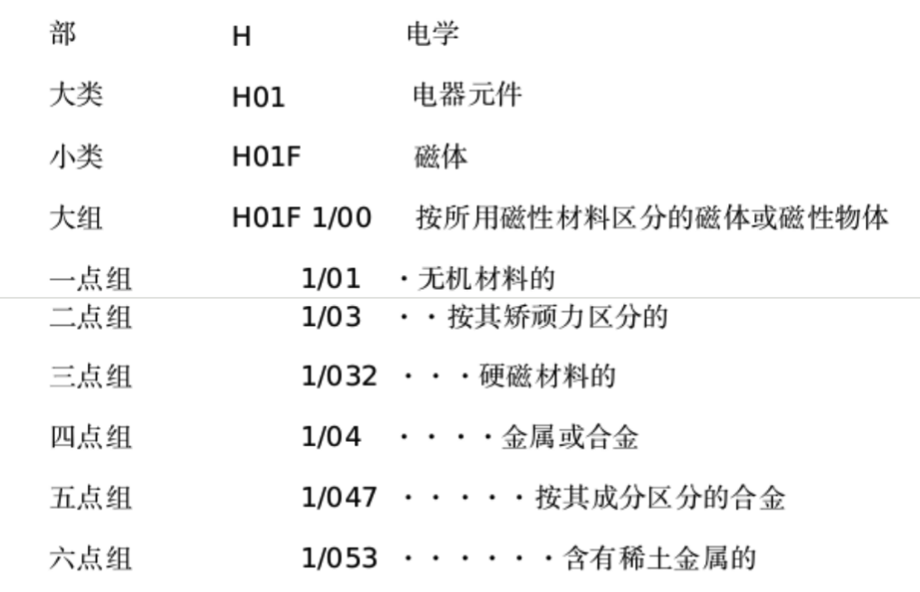 举例:小组H01F 1/053 实际涉及的是"按其矫顽力区分的包括硬磁合金尤其是含有稀土金属的 无机材料的磁体"。