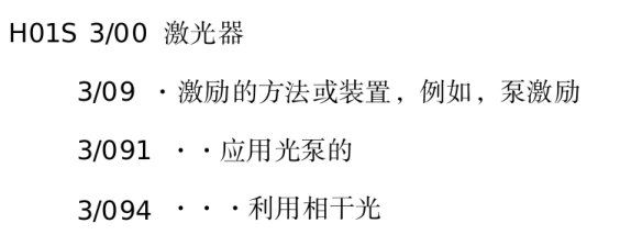 举例:H01S 3/094 的小组类名表述:利用相干光的光泵激励激光的方 法和装置的激光器。