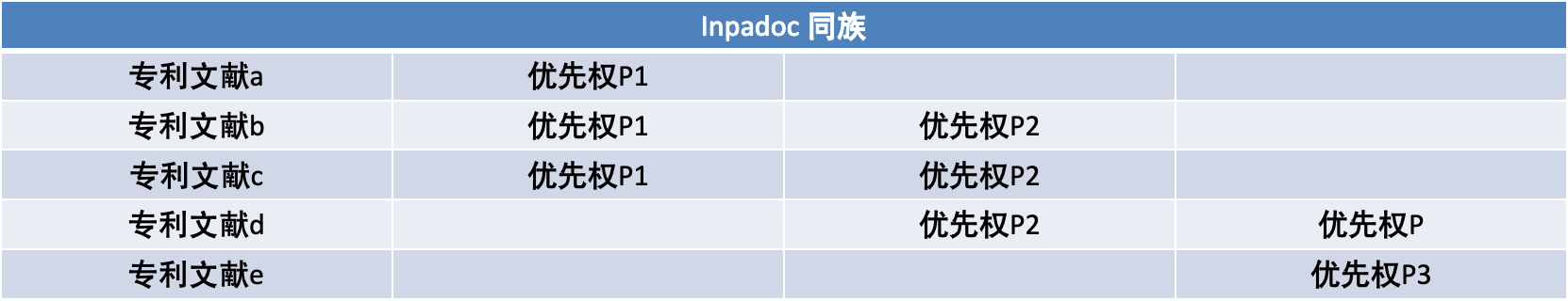 专利文献a属于专利族P1,专利文献b和c属于专利族P1-P2,专利文献d属于专利族P2-P3,专利文献e属于专利族P3。