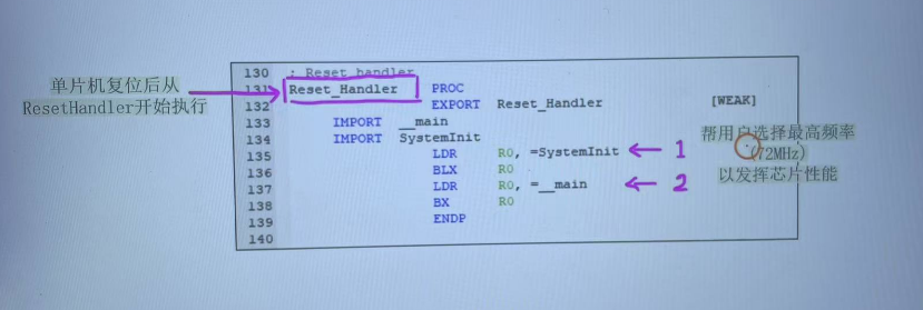• 在启动文件中,可以找到这一段的代码,其中单片机启动的时候,先是执行了SystemInit这一段代码,也就是先配置 系统时钟 为72MHz,然后在执行main里面的函数。