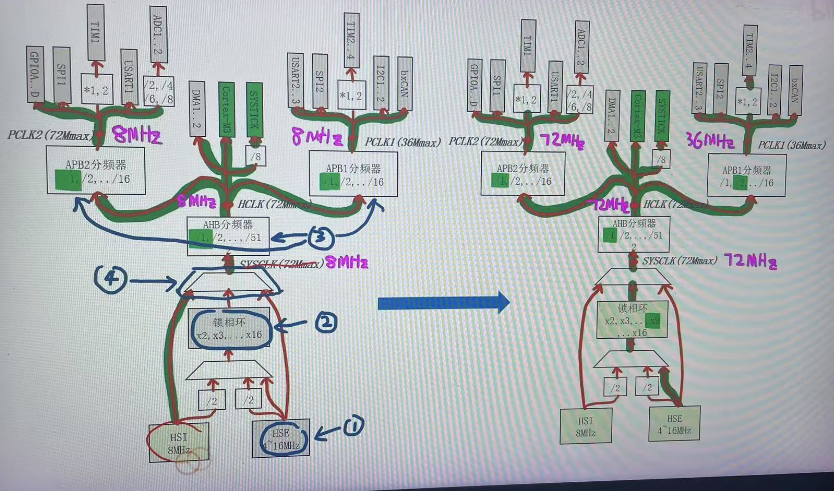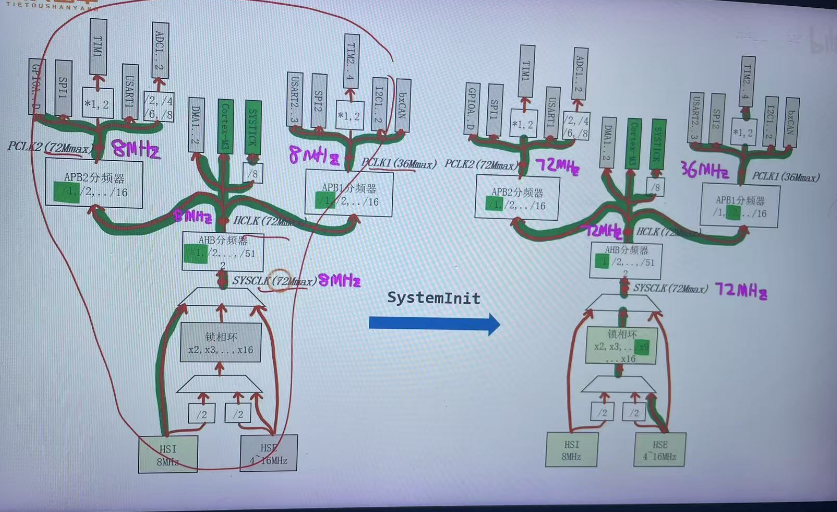 • 如图,经过SystemInit之后,时钟由 8HMz 变成 72MHz