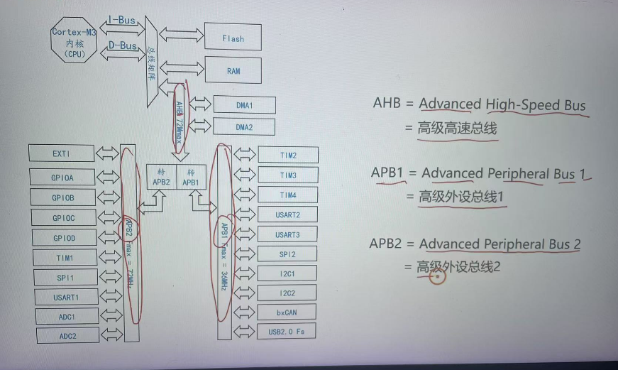 • 通过SYSCLK分频,可以进一步 得到 这三条总线相对应的时钟,也就是说对SYSCLK进行分频,得到的HCLK,PCLK1和PCLK2。