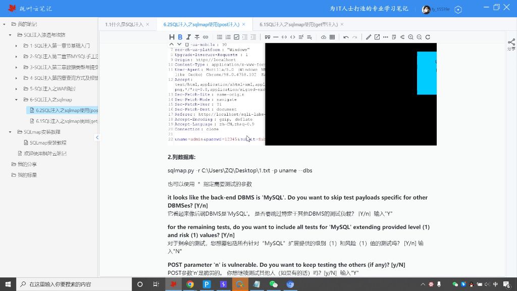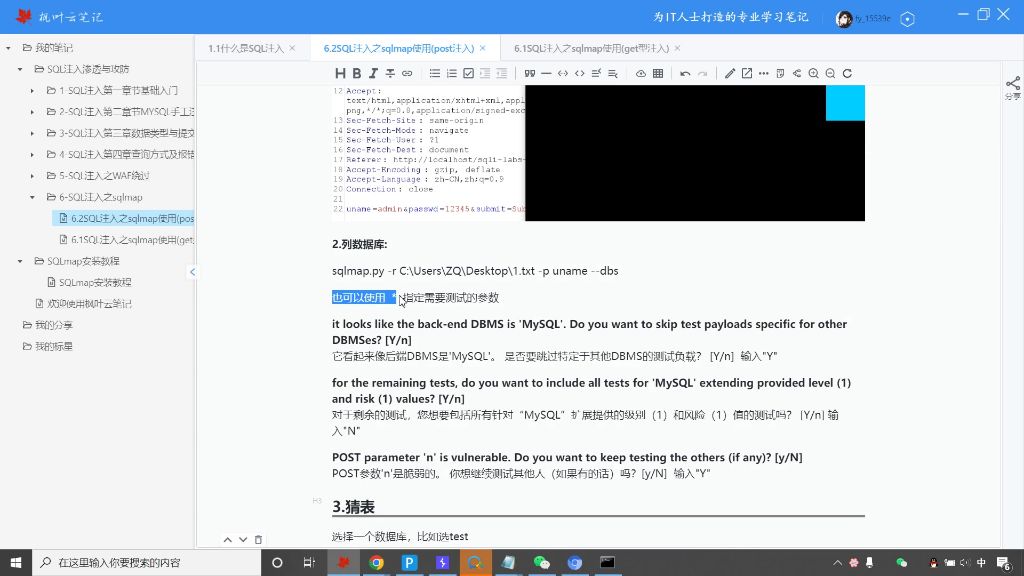 | SQLMap参数指定 | -r加载文件扫描,-p指定参数(如username),--dbs枚举数据库 | -p与*标记的区别(*可能影响注入语句完整性) | ⭐⭐⭐⭐ |