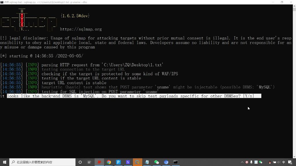 - 询问是否跳过其他DBMS的测试(建议选Y)