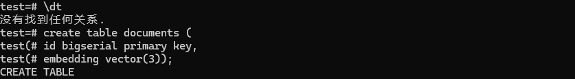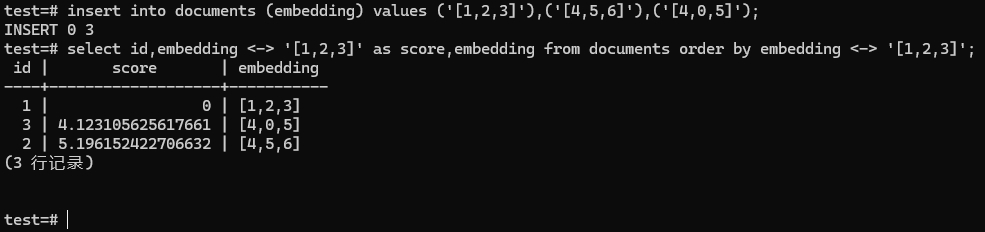 test=# insert into documents (embedding) values ('[1,2,3]'),('[4,5,6]'),('[4,0,5]');