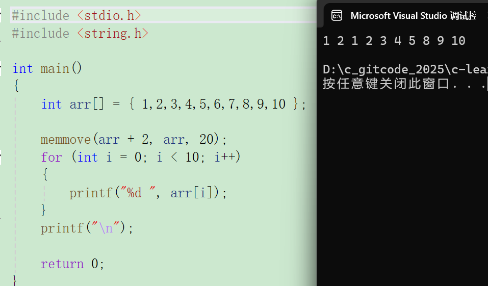 c#include <stdio.h> int main() { int arr[] = {1,2,3,4,5,6,7,8,9,10}; memmove(arr+2,arr,20); for(int i = 0;i < 10;i++) { printf("%d ",arr[i]); } printf("\n"); return 0; }