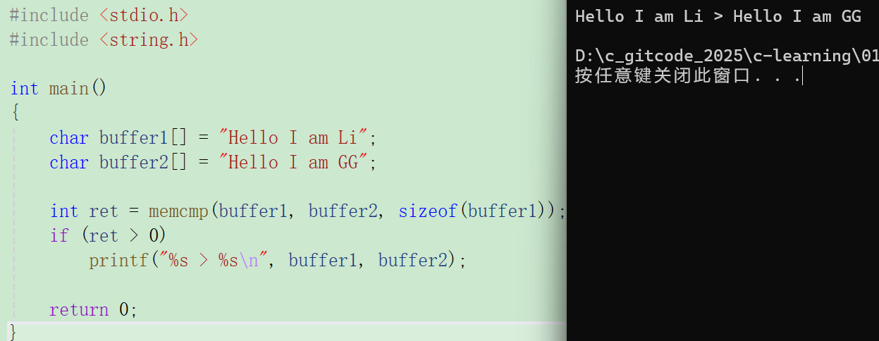 c#include <stdio.h> #include <string.h> int main() { char buffer1[] = "Hello I am Li"; char buffer2[] = "Hello I am GG"; int ret = memcmp(buffer1,buffer2,sizeof(buffer1));//这里使用sizeof,如果是strncmp就用strlen if(ret > 0) printf("%s > %s\n",buffer1,buffer2); return 0; }