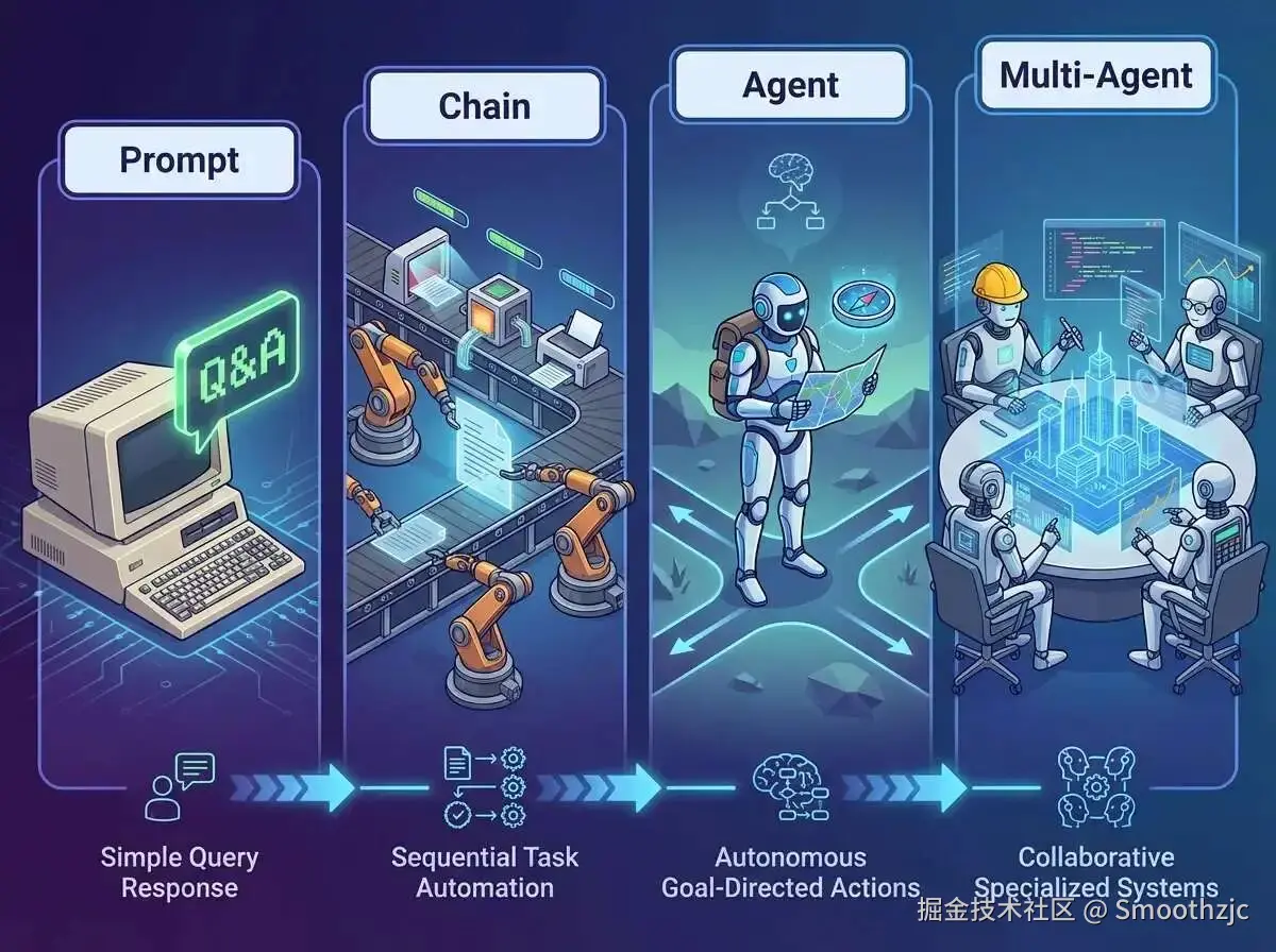 自从 ChatGPT 爆火以来,大家都在研究怎么把这股"聪明劲"用到实际工作中。简单来说,我们对 AI 的使用方式经历了一场从"简单对话"到"自主干活"的进化。