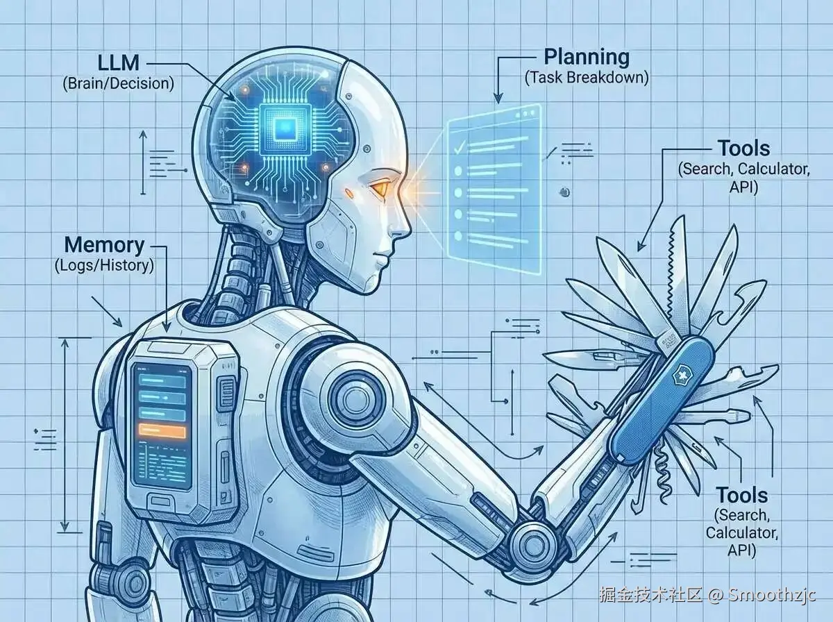 - 通俗解释: 以前的 AI 只是个 "大脑" (LLM),能陪你聊天、回答问题,但没手没脚。而 Agent 就是 "大脑 + 双手 + 工具箱" 。它不仅能动脑子,还能根据你的目标,自己去上网、查文件、写代码,把活儿干完。
