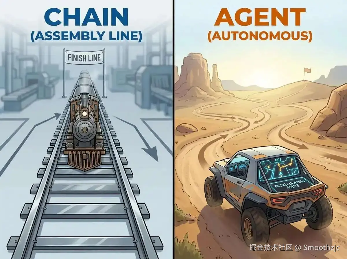 | Chain | 固定流程编排 | 流水线 | 稳定、高效、可控 | 死板,遇到突发情况就卡壳 |